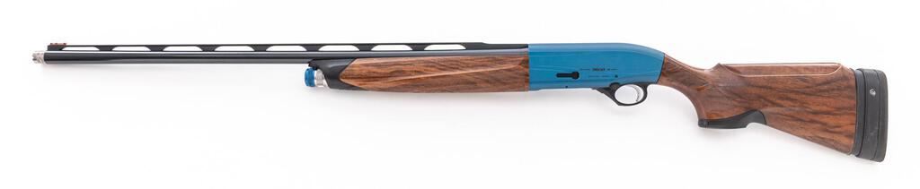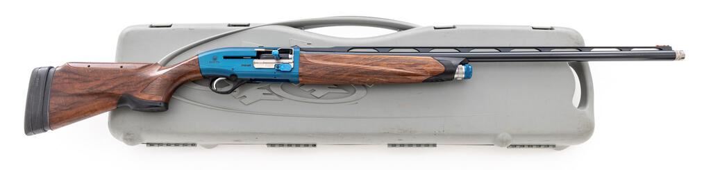 Beretta Model A400 Xcel Parallel Target KO Semi-Automatic Shotgun, #XA096348. 12 ga. 30" barrel has tapered high vent rib, replaceable front target bead, 3" chamber, and is fitted for Beretta Optima choke tubes (6 included). A400 action is enclosed in a blue anodized alloy receiver, with attached shell catcher and black trigger guard. The finger-groove forend and pistol grip buttstock are "C" Grade walnut, with special checkering and grip cap, adjustable comb and stock fit via shims, and a Kick-Off recoil system. Stock dimensions are currently 14-1/2"x1-1/2"x1-5/8". Contained in a gray plastic Beretta hard case, including tools, extra shims, and instructions. Mfg'd 2013. Condition is excellent showing very little use. Wood has some edgewear but few handling marks. Action locks tight and operates correctly, bore is mirror bright. Est.: $1,000-$1,200. (Modern)