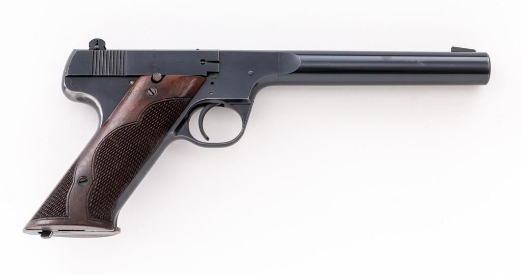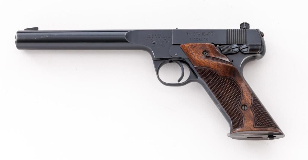 Hi-Standard Model E Semi-Automatic Pistol, #36464, .22 L.R. cal., 6.75" heavy bull barrel, blade front and square notch adjustable rear sights, blue finish, deluxe checkered walnut target two-piece target grips with a thumb rest on the left panel, and one correct two-tone 10-rd. magazine. Left barrel lug is marked "MADE IN U.S.A./THE HIGH STANDARD MFG. CO./NEW HAVEN CONN." Mfg'd 1938. Pistol is in near fine overall condition retaining approx. 90%-92% factory blue finish with some thinning of finish at the muzzle, highpoint edgewear, and on the grip straps. Grips are very good showing some flattening to the checkering and flea bite compressions at the bases with a good look. Action is crisp, bore is very good. The Model E was a high-quality deluxe model of the hammerless series with a total production of approx. 2,600 units. Est.: $700-$900. (C&R/PPT)