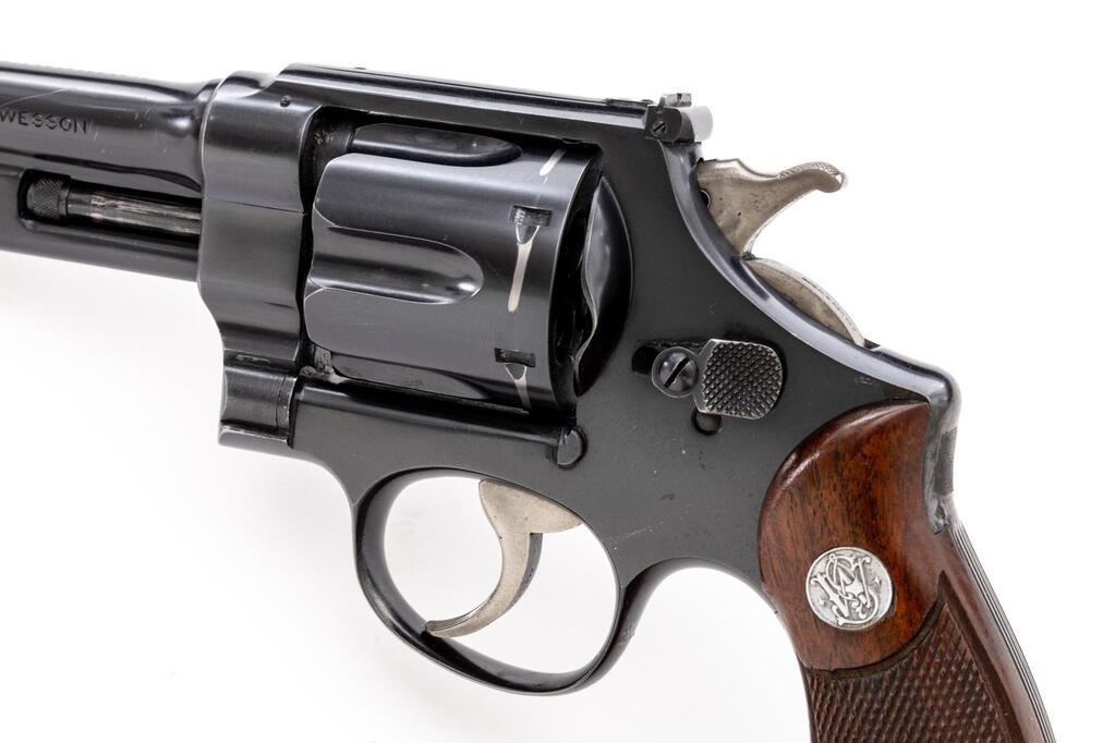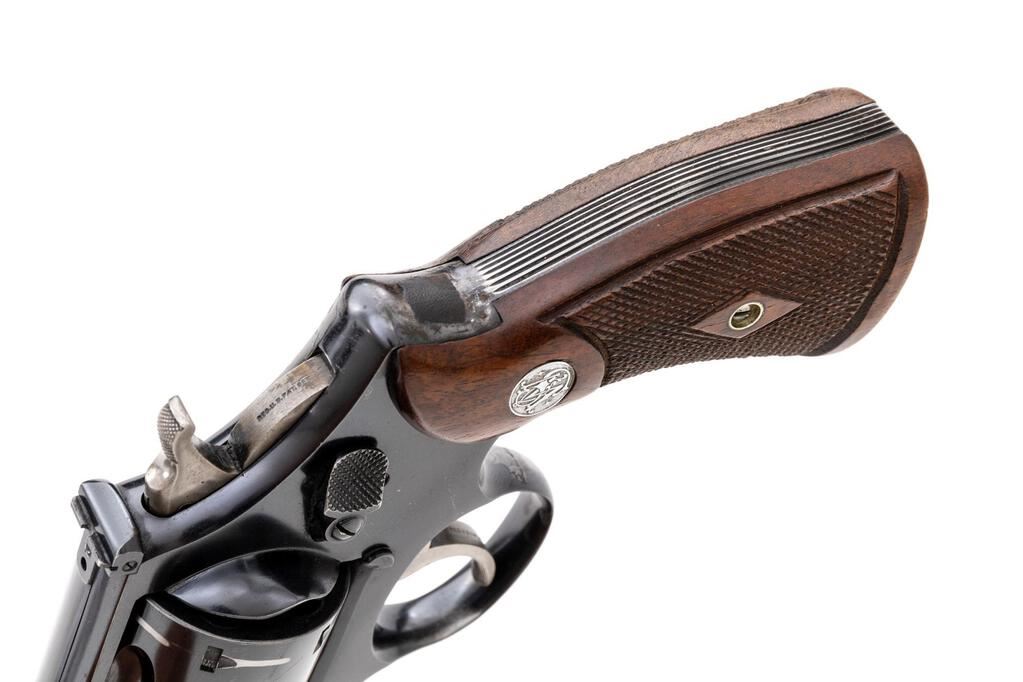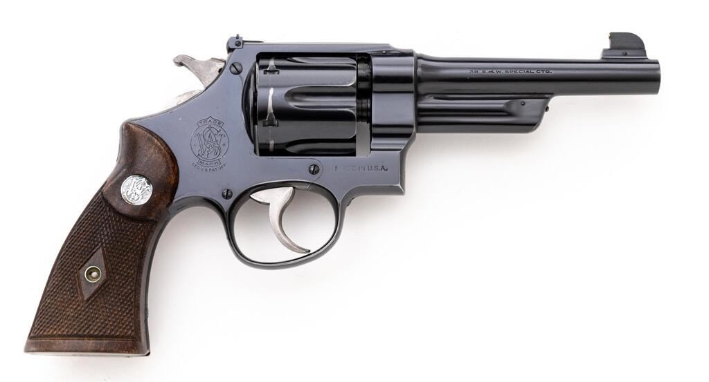 Scarce Pre-War Smith & Wesson .38/44 Outdoorsman Double Action Revolver, with 5" Barrel, #56282, .38 S&W Spec. cal., blue finish, checkered diamond center walnut Magna grips, McGivern gold bead front and square-notched fully adjustable rear sight, with color case hardened hammer and trigger. Frame and yoke with matching assembly numbers (12782). Barrel, cylinder, extractor, and back of right grip are numbered to the gun. Shipped to Western Auto Supply, Los Angeles, CA, April 14, 1938; with factory letter signed by S&W Historian Roy G. Jinks. Letter verifies barrel length, finish, front and rear sights. In a correct but unnumbered two-piece blue picture box. Condition is very good retaining approx. 90% factory blue. Muzzle wear, thinning to the back strap, and wide index line to the cylinder accounts for most of the finish loss. Square piece of what looks like textured tape has been adhered to back of the frame, below the hammer, otherwise showing scattered light scratches and blemishes associated with handling and use, the most noticeable is a scratch to the left side of the barrel. Only the slightest amount of case colors remain on the hammer and trigger. Grips are near excellent with sharp checkering and a small amount of typical light handling marks. Action is crisp and cycles smoothly. Cylinder locks up well with just a little rotational movement and end shake. Bore appears near excellent, bright with well-defined rifling. Box shows darkening, age, and wear, heaviest around the edges. The metal reinforced corners are intact, graphic is very dark and now faintly legible. Est.: $2,000-$2,500. (C&R/PPT)