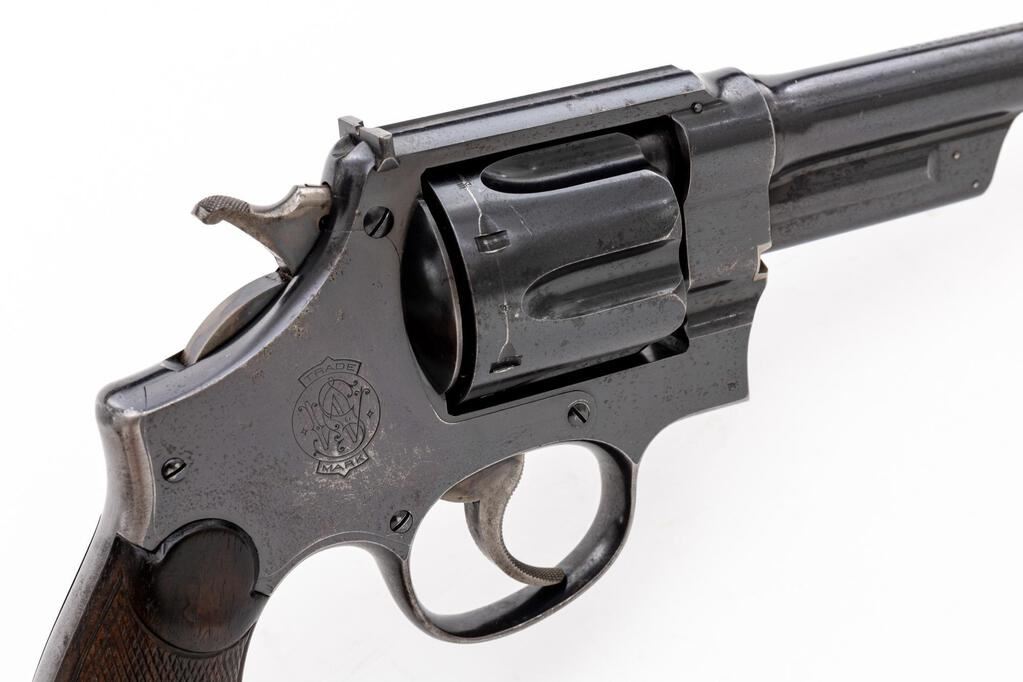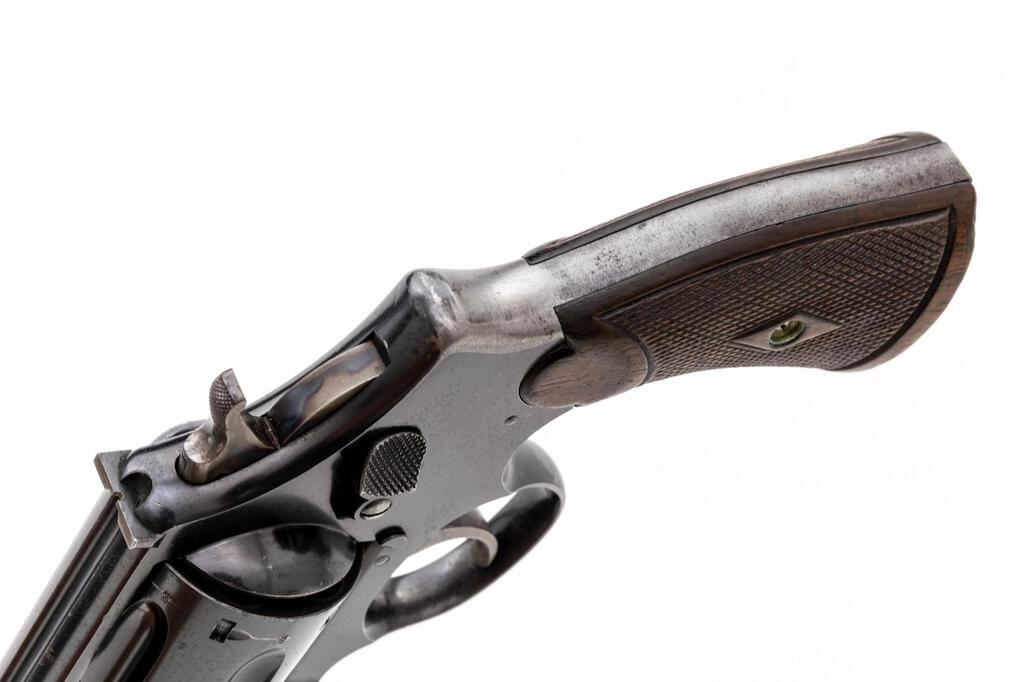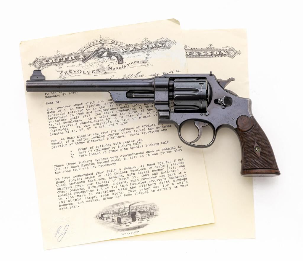 Special Order Smith & Wesson .44 Hand Ejector First Model (Triple Lock) British Target Double Action Revolver, #3971, .455 Mark II cal., special order 7.5" pinned barrel, blue finish, checkered diamond center walnut grips, round blade front sight, special order military drift adjustable target rear sight, color case hardened hammer and checkered trigger. There is a small "(crown)BV" British proof mark on right side of the frame; "(crown)BV" and "(crown)BP" proofs on left side of barrel and on cylinder. Barrel address is located on top of barrel, which has no other markings. Frame and yoke with matching assembly numbers (961). Barrel, cylinder, yoke lock and extractor are numbered to the gun. Grips are not numbered. Shipped to Chas. Osborne, Birmingham, England, March 15, 1909; with factory letter signed by S&W Historian Roy G. Jinks. Letter states that this revolver was mfg'd in a special production run of 7.5" barreled .455 Mark II revolvers with a military drift adjustable rear sight. This order was for 8 units total, with a previous group having shipped earlier in the year. Condition is very good retaining approx. 75% original factory blue. Metal with general moderate nicks and scratches, and some mild frosting. Front and back strap have worn to a bare gray gun metal. Hammer and trigger retain approx. 70%-75% case colors, strongest on the hammer. Factory lettering and proof marks are clear. Grips have a few surface dents and mild flattening to the checkering detail, both show wear that is consistent with the overall condition of the revolver. Action cycles smoothly and locks up securely. Bore is very good, bright, showing moderate wear, rifling is clearly defined. Est.: $2,000-$2,500. (C&R/PPT)