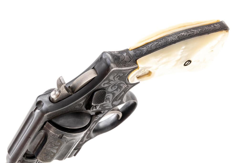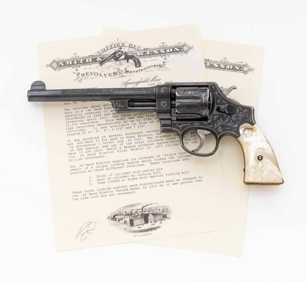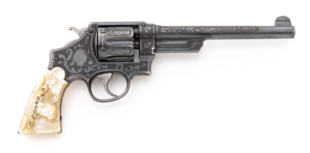 Engraved Smith & Wesson .44 Hand Ejector First Model (Triple-Lock) Double Action Revolver, #2268, .44 S&W Spec. cal., 7.5" pinned barrel, blue finish, pearl grips; right grip with a carved steers head that is adorned with several small clear gemstones at the eyes, ears, and across the forehead. This revolver also features a round blade front and standard notched rear sights, color case hardened hammer and smooth trigger. Nicely accomplished non-factory engraving covers approx. 70% of the metal surfaces. Engraving includes scroll and floral motifs set against a punch-dot background. Work is not signed. Frame and yoke with matching assembly numbers (4011). Barrel, cylinder, yoke lock and extractor are numbered to the gun. Shipped to Schoverling Dale & Gale Co., New York City, NY, Nov. 18, 1908, with factory letter signed by S&W Historian Roy G. Jinks. Letter verifies barrel length, finish, and the original grips are listed as checkered walnut. Condition is very good overall retaining approx. 90% low luster finish. Wear at the muzzle, lower portion of the frame/trigger guard, and front strap accounts for much of the finish loss. Factory lettering is clear, and engraving is crisp. There are intermittent tiny pin prick blemishes present on parts of the metal, as well as a few small mars to the left side of the front sight blade. Only trace amounts of case coloring remain, and there is very mild pitting visible on the sides of the trigger. Both grips show moderate yellowing and have a nice, aged appearance. Left grip fits just a little small with a small chip at the heel, and a vacant spot at the upper edge that likely held some sort of decorative medallion. Right grip fits better, carving is defined, with a tiny chip at the toe and a little larger chip missing from the heel, as well as a small age crack in between the steer's mouth and grip edge. Action cycles smoothly and locks up securely. Bore shows moderate wear, is clean, lands and grooves are clearly defined, but there are a few small spots of erosion approx. 2" down from the muzzle. Est.: $2,000-$3,000. (C&R/PPT)