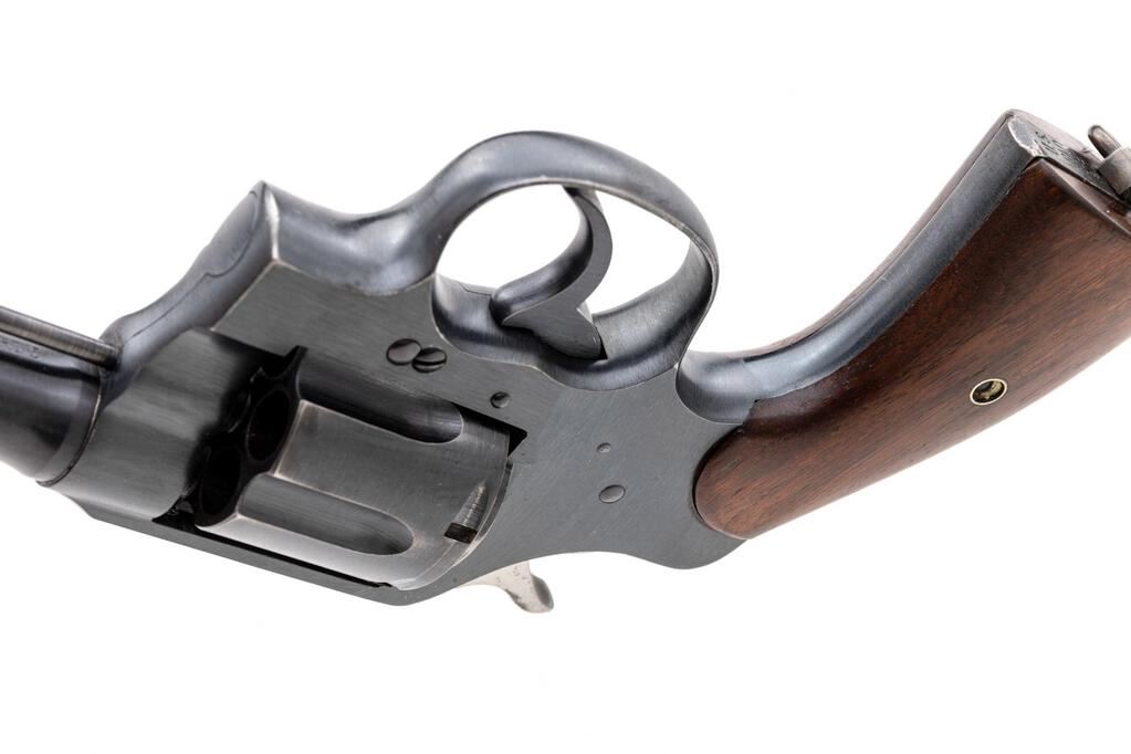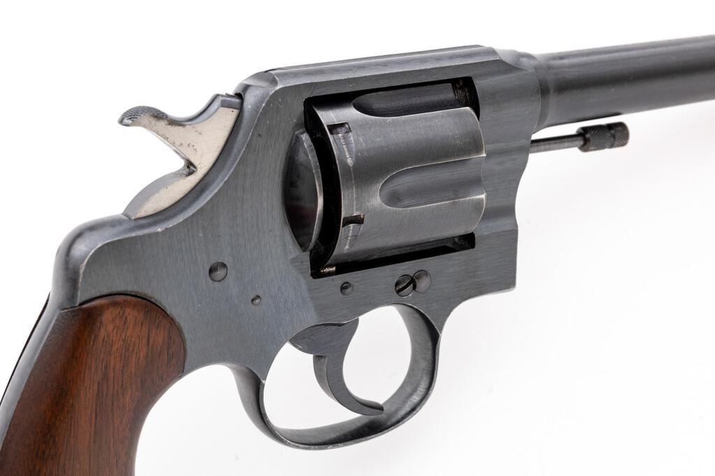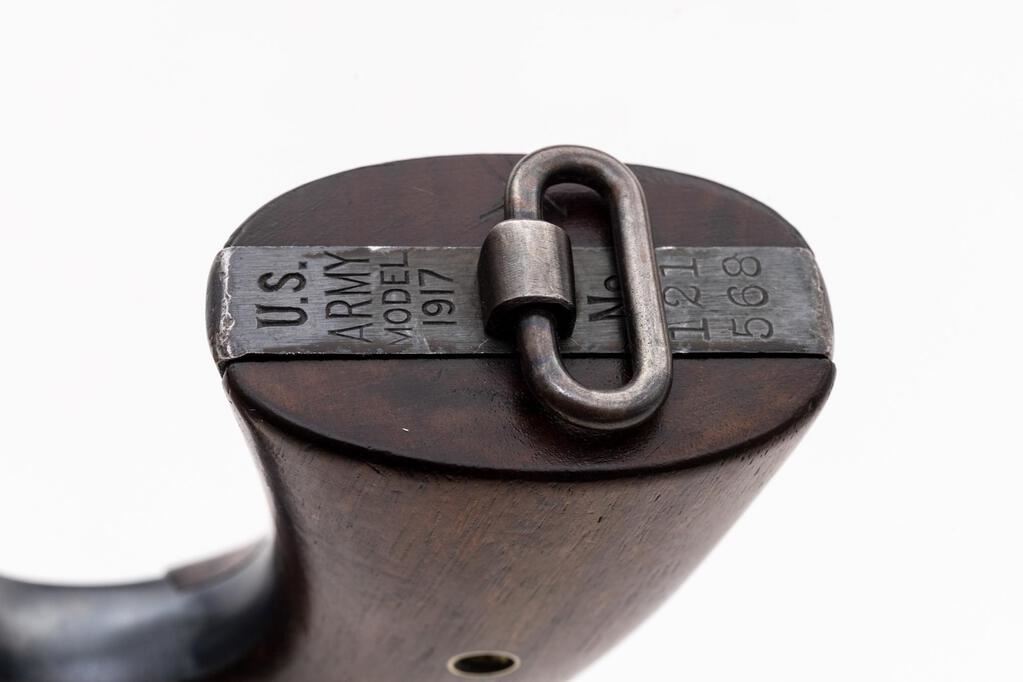 U.S. Army Colt Model 1917 Double Action Revolver, #121568, .45 ACP cal., 5-1/2" barrel, blue finish, smooth walnut grips, blade front sight, standard notched rear sight, with lanyard ring. Mfg'd 1918. Butt of the gun has standard U.S. Army markings and serial number. Left side of frame, in front of the trigger is marked "(eagle head)/S20". Bottom of the barrel is marked "UNITED STATES PROPERTY". Metal surfaces rate in fine condition and retain approx. 93%-94% factory blue. There are intermittent light scratches on the barrel and cylinder. Muzzle and edges of the trigger guard show light wear. Backstrap shows some thinning and mild patina. Factory lettering is crisp. Grips are very good, left grip with more frequent shallow surface dents and handling marks, right grip shows less handling wear. Both have a number written on the back (214915), that does not match any numbers on the revolver. Action cycles smoothly and locks up securely. Bore appears excellent and is bright with well-defined rifling. Est.: $1,200-$1,800. (C&R/PPT)