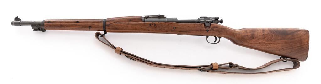 Springfield Model 1903 Bolt Action Rifle, #803484, .30-06 cal., 24" barrel, parkerized finish, walnut stock set, blade front sight and adjustable folding leaf rear sight. A very good condition nickel oiler is in the butt trap and an excellent condition U.S.G.I. leather sling is attached to the swivels. Marked on top of receiver ring "U.S. SPRINGFIELD ARMORY MODEL 1903". Barrel behind the front sight is marked "H.S.(Flaming Bomb)3 44". The scant stock has an "S" stamped into the tip of the forend. Condition overall is very good as rebuilt for service in WWII, with the metal retaining approx. 90% finish, with polishing to the receiver and bolt knob. Stock set has been sanded smooth and oiled over old handling marks, now very good. Action operates smoothly, bright bore is excellent with well-defined rifling. Est.: $800-$1,100. (C&R)