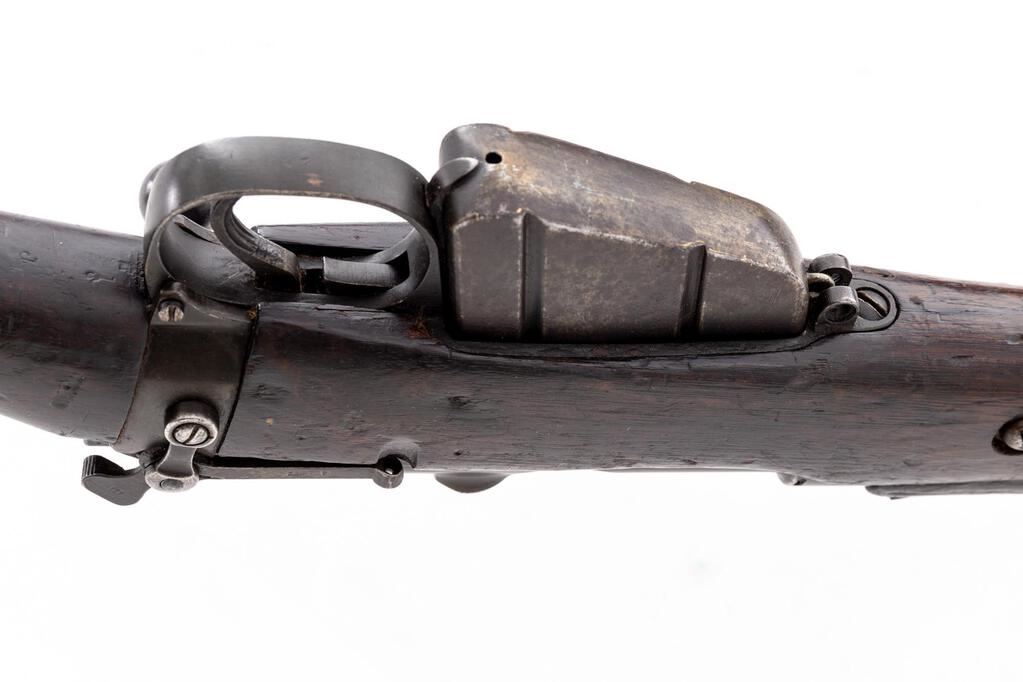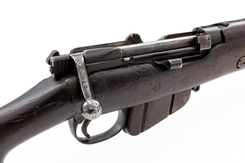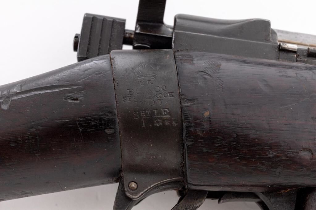 British No. 1 MK 1*** Lee-Enfield Bolt Action Rifle, #Q15509, .303 Brit. cal., 25.2" barrel, blued finish, hardwood stock set, blade front sight with protectors and rear sight adjustable for windage and elevation. Right-side action body marked "(crown)/E.R/B.S.A. Co/SPARKBROOK/1907/sht.le/1.***". Marked "EY" on top of receiver, barrel shank, and right-side buttstock. Mismatched numbers on bolt handle, other numbers matching. Faint number on forend. Rifle has early features to include action body without charger bridge, bolt head with dovetail, magazine cutoff, windage adjustable rear sight with bone inserts, protectors mounted to rear hand guard, and long-range volley sight aperture and pointer. Condition overall is good with the metal retaining approx. 75% finish, with old patina to the magazine. Front hand guard appears to be a later replacement. There are red paint spots on the buttstock and forend. Condition of the wood is good with overall bruises and handling marks to the dark finish. Action operates smoothly, dark bore is fair to good rifling. No visible import marks. Est.: $600-$800. (C&R)