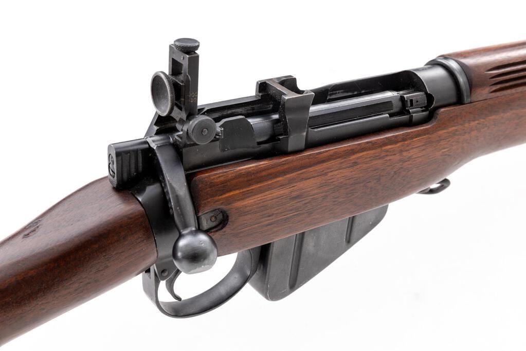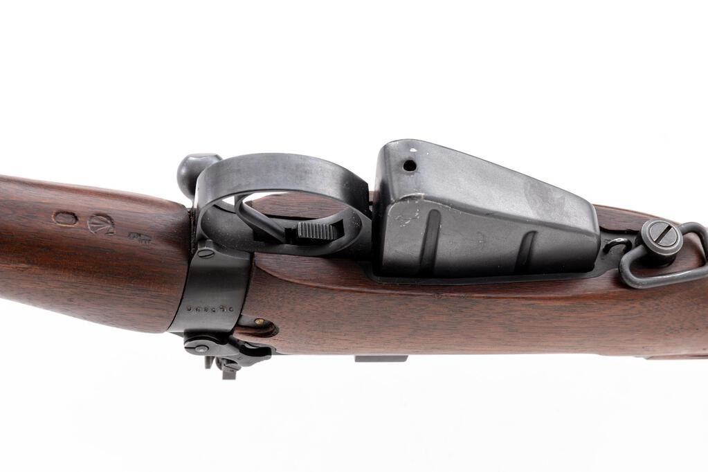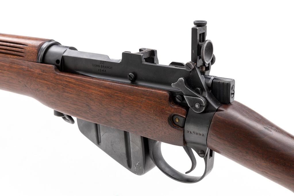 Canadian No. 7 MK 1 Lee-Enfield Bolt Action Training Rifle, with Wooden Transport Chest, #0L5896, .22 LR cal., 25.2" barrel without bayonet lug, blued finish, walnut stock set, blade front sight with protectors and special folding short leaf rear sight graduated at 20 and 200 yards with a knurled disc aperture. Bolt has two-piece firing pin with offset "0" stamped bolt head for rimfire cartridge. A target-type sling swivel is fitted to the front trigger guard screw. The special magazine is single shot and has a tapered follower for a loading ramp and an opening at the rear for fired cases. Marked on left-side receiver ".22"/LONG BRABCH/1944". "S" stamped on top of comb. There are "Broad Arrow C" Canadian property stamps on the top of the receiver ring, rear sight leaf, top of forend, and wrist of buttstock. Matching numbers on rear of bolt handle. Condition overall is near excellent with over 90% finish remaining on the metal, with finish wear to the bolt body and scratches to the magazine. There are several dents to the top of the stock wrist and comb, otherwise the wood is near excellent with scattered handling marks to the even-colored finish. Action operates smoothly, bright bore is excellent with sharp well-defined rifling. Import stamped on underside of barrel. The wooden transport chest measures 46.75"x4.75"x8.25" and has dovetailed corners and rifle sling handles. Two sliding blocks hold the rifle in place. Stenciled on each side "CGB 7148/CHEST MK.1 22 In.C.NO.7RIFLE". There is a paper label on one end with the serial number of a different rifle. There is a chip missing from one corner and a crack to one of the wooden hinge protectors, otherwise chest condition is very good showing chips and scuffs to the green-painted finish. Lid and hinges operate smoothly. Est.: $1,400-$1,800. (C&R)