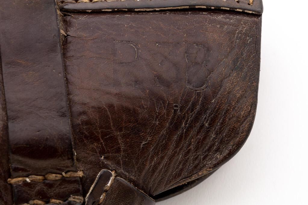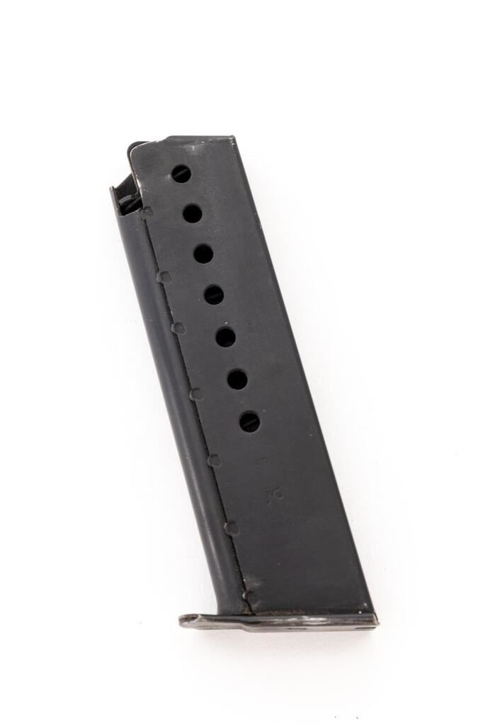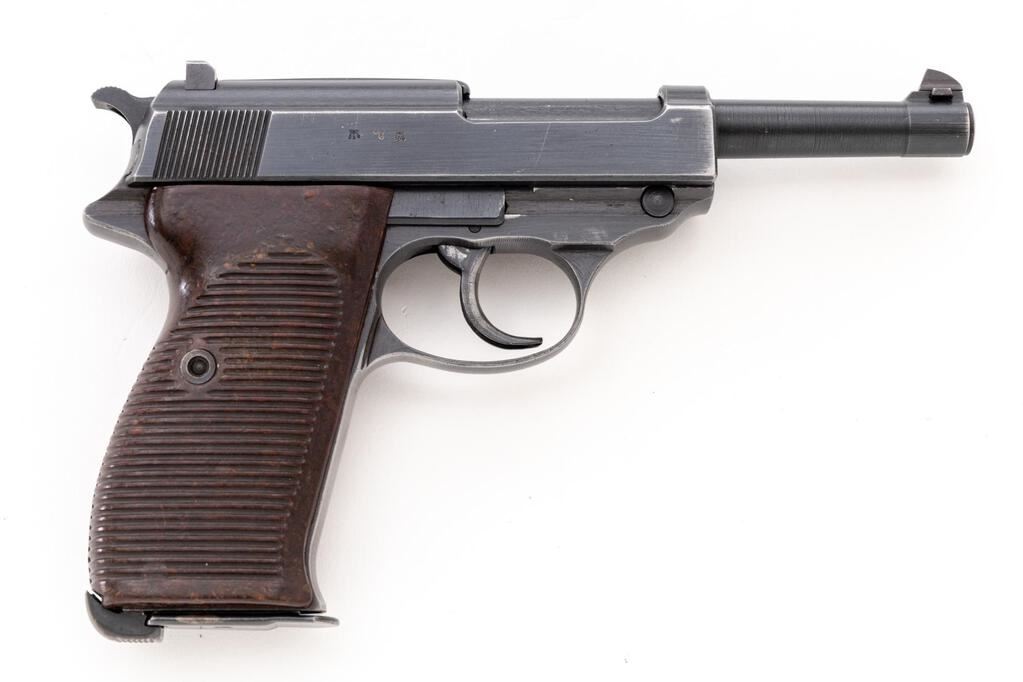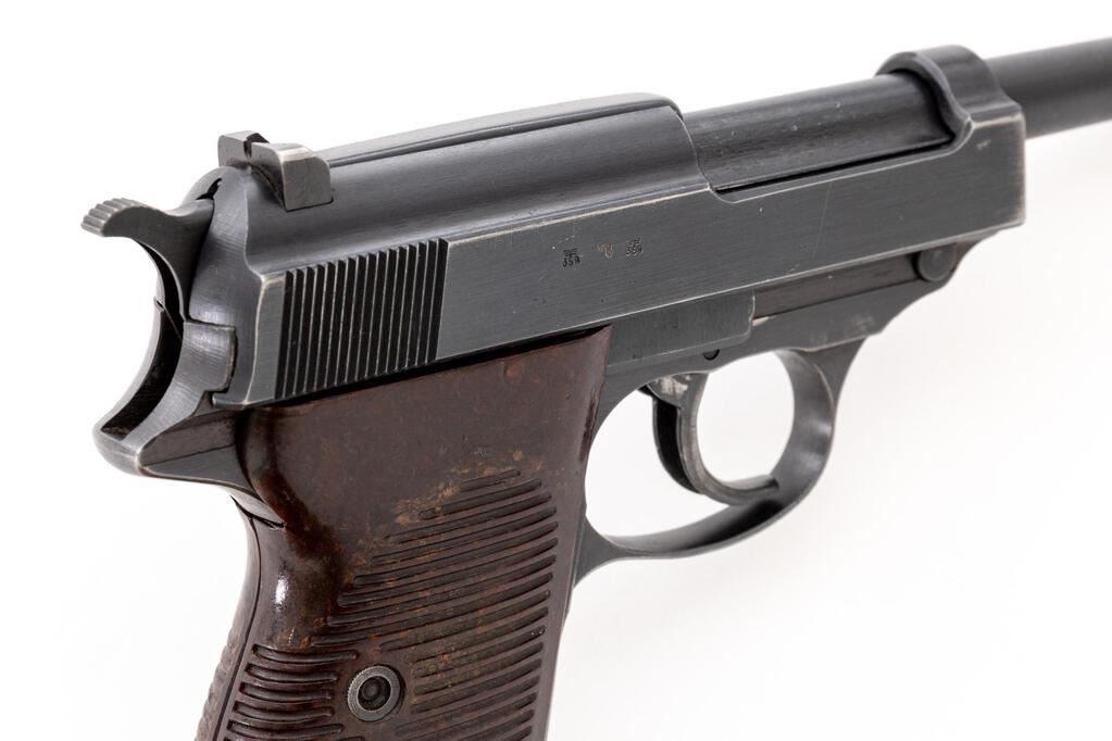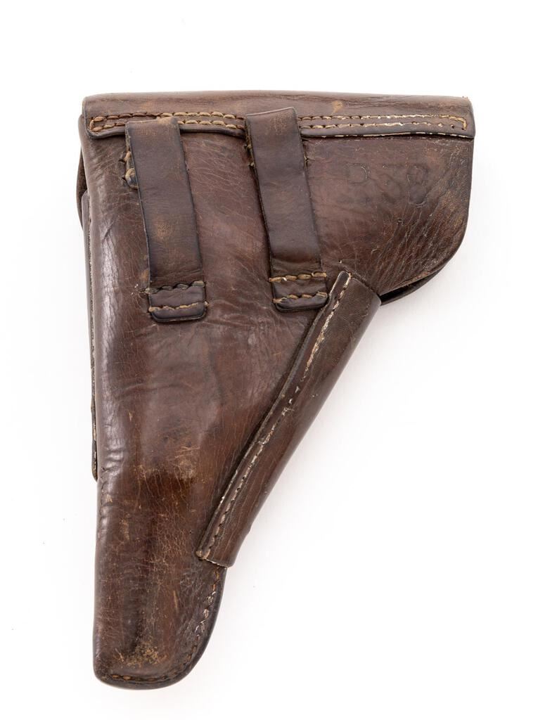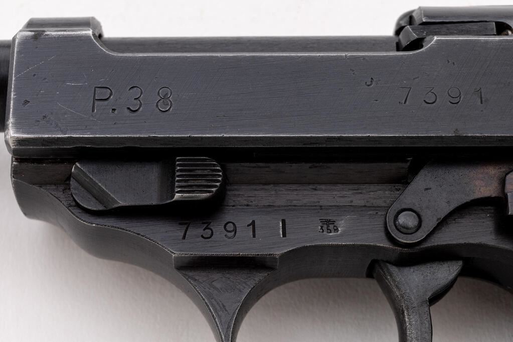 WWII German P-38 AC-44 Semi-Automatic Pistol, with Holster, #7391L, 9mm, 5" barrel, blued finish, double action, Nazi eagle firing proof on slide, "(eagle)359" waffenampts on frame and slide, barrel marked on the internal side with "(eagle)WaA70" waffenampt, hammer drop safety, drift adjustable blade front sight and fixed rear sight with small "u" slot, all visible numbers matching, lanyard loop, bottom mag release, dark brown Bakelite grooved grips, one blued steel magazine marked P.38v with no waffenampts, and one blued steel magazine marked jvd and P.38U, with faint "WaA708" waffenampt. Includes a brown soft shell P.38 holster marked jwa4 and P.38 on the back. Condition is good retaining approx. 80% original blued finish with wear to muzzle sides, front and high edges of the slide, tops of the sights, tips of the hold open and safety levers, trigger guard edges, rear of frame, edges of the mag release, and lanyard loop. Front grip strap is thinning to gray. Action, hold open, and hammer drop safety all function properly; bore is bright and shiny with just a hint of frosting. Grips show only light wear. Magazine in the gun shows only slight wear from use with a few lines on the back spine. Extra magazine shows a dull matte finish with minor wear from use, and a large scratch on the bottom of the base plate. Holster shows age, wear, scuffs & scratches, soiling and age darkening, and minor cracks in the leather, but overall is still sound. A soldier's name has been blacked out on the inside of the top flap. Est.: $900-$1,400. (C&R/PPT)