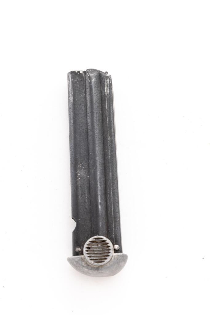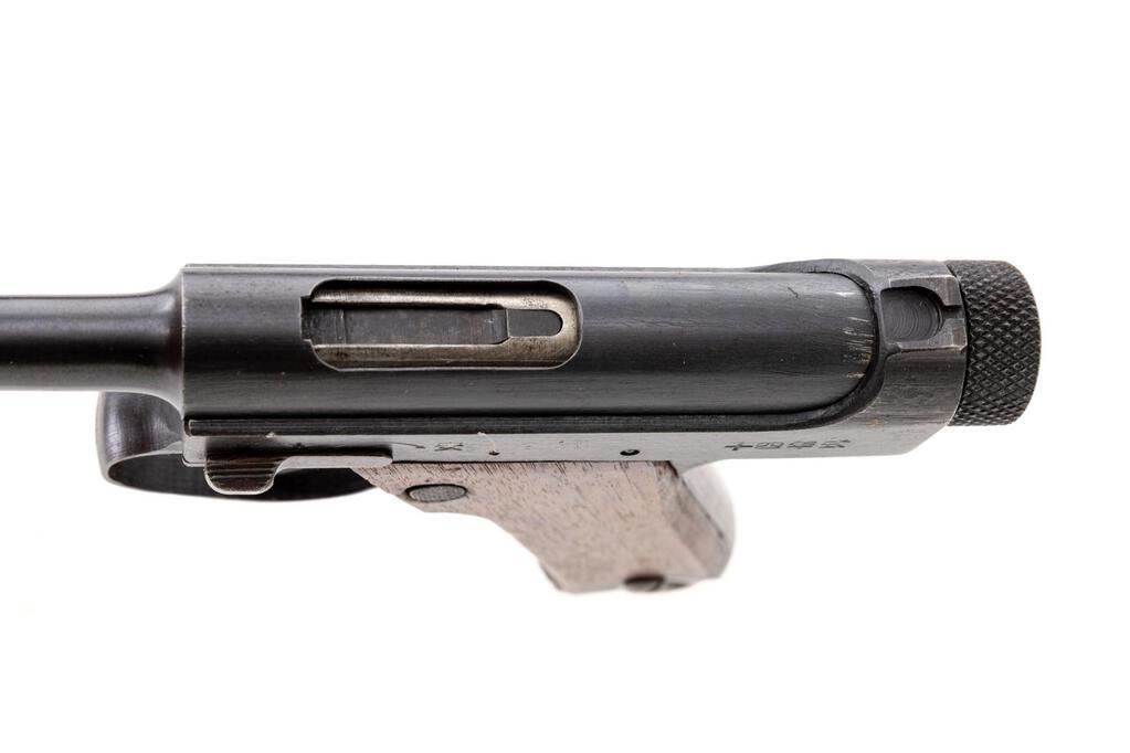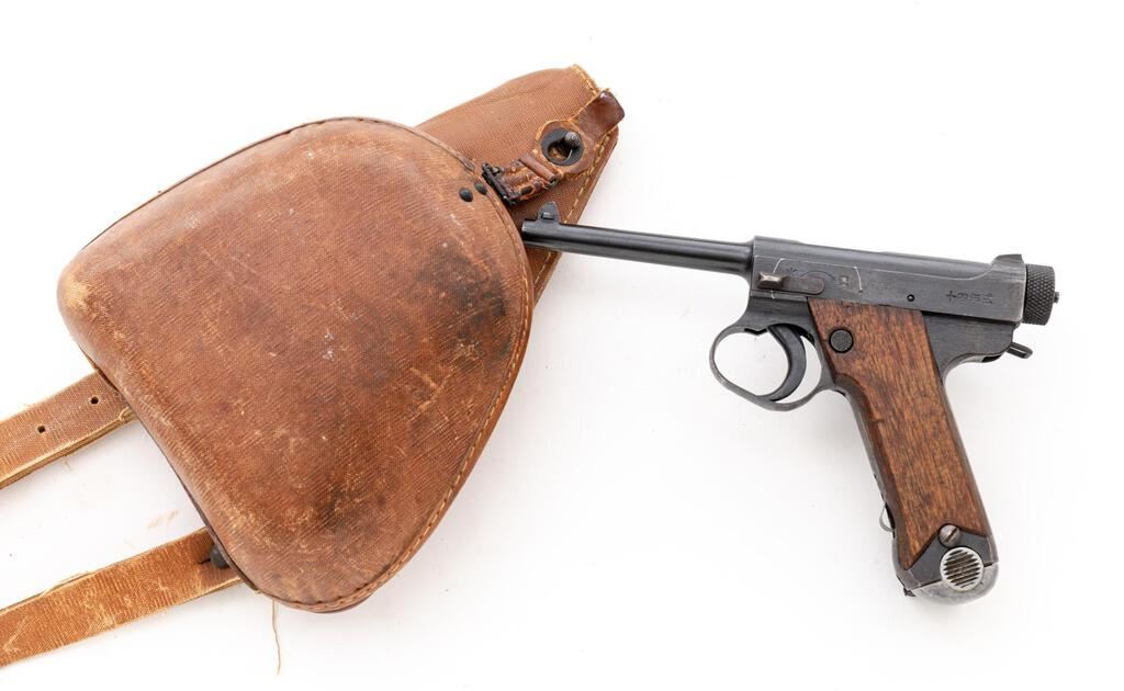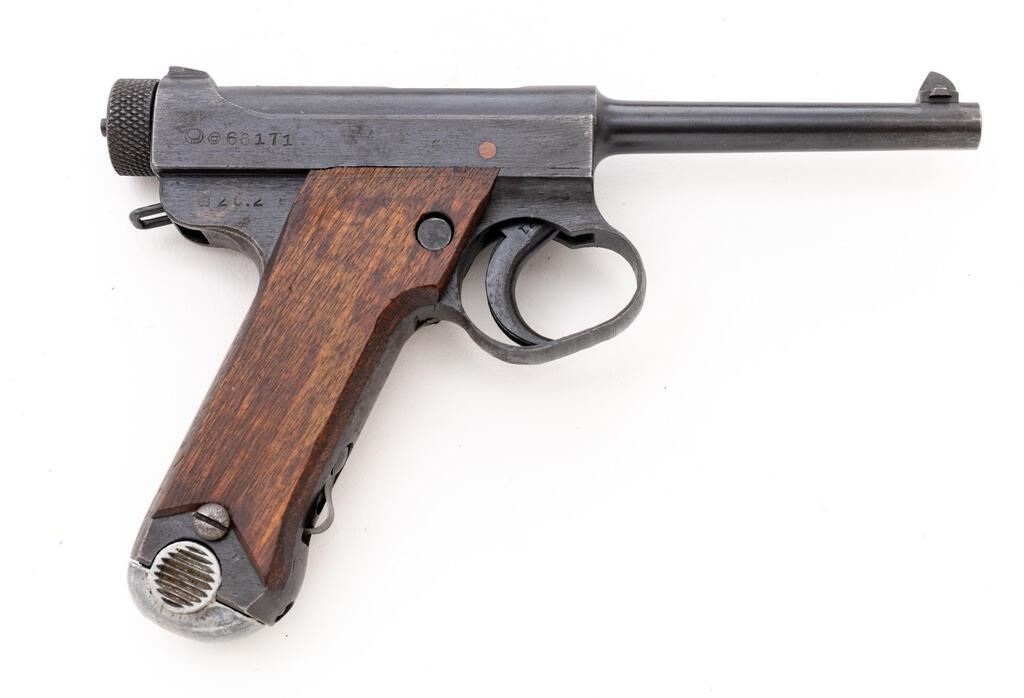WWII Japanese Type 14 Nambu Semi-Automatic Pistol, with Holster & 2 Matching Magazines, #68171, 8mm Nambu cal., 4.75" barrel, blued finish, all visible numbers matching, Toriimatsu factory of Nagoya Arsenal proof marks, dated Showa 20.2 (February 1945), large trigger guard, drift adjustable inverted "V" front sight, integral fixed rear sight with square notch, coarse knurled cocking knob, and lanyard loop. Smooth mahogany wood grips are numbered to the gun, with two matching numbered blued steel magazines with pot metal bases. Includes a rubberized canvas hard shell holster with shoulder strap, extra firing pin, and cleaning rod. Condition is excellent, retaining approx. 90% original late-war blued finish, with slight holster wear at the muzzle sides and bottom front of barrel, high edges and rear of the slide, front edge of the trigger guard, top of slide from firing, typical half-moon scratch around the safety lever area on side of slide, front and rear grip straps are thinning slightly with a light freckling. Action, hold open, and safety all function properly; bore is bright and shiny. Grips are very nice showing only the slightest use; grip screws show some wear, with clean slots. Magazines show thinning and wear from use, with heavy freckling over most of the surfaces; mag bases show minor dings and wear from use, and light oxidation. Holster is in good condition with a few missing stitches on the leather hinge for the top clamshell cover, overall stiffness to the body and component parts, some separation to the laminations on the shoulder strap, a GI's name written on the back side (hard to make out exactly what it reads), extra firing pin inside, and blued cleaning rod. There is some soiling, scuffs, scratches, and wear to the outside of the holster, and minor cracking to the leather retaining tab. Overall, an excellent example in very nice condition. Est.: $800-$1,100. (C&R/PPT)