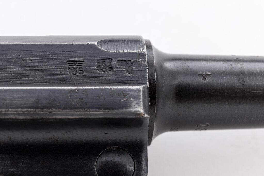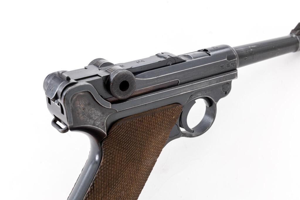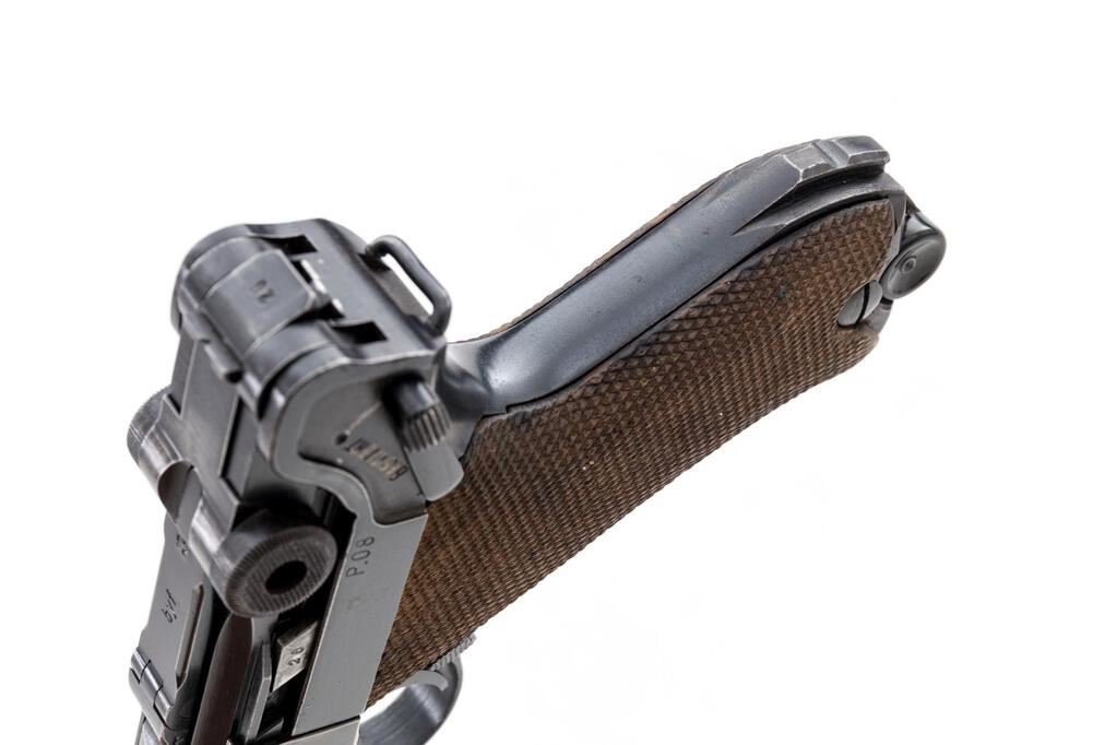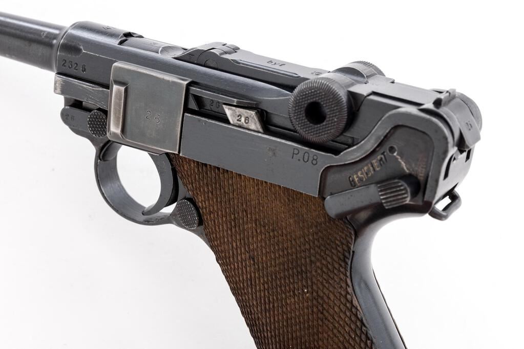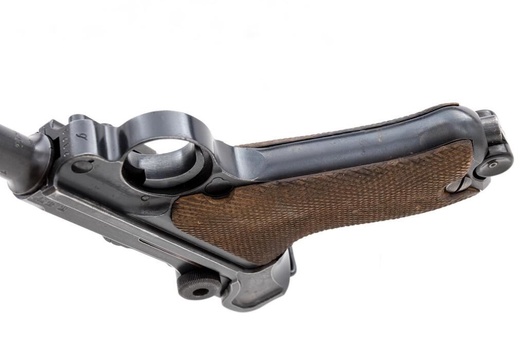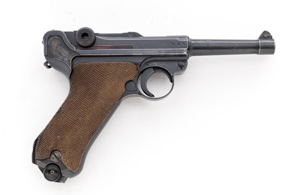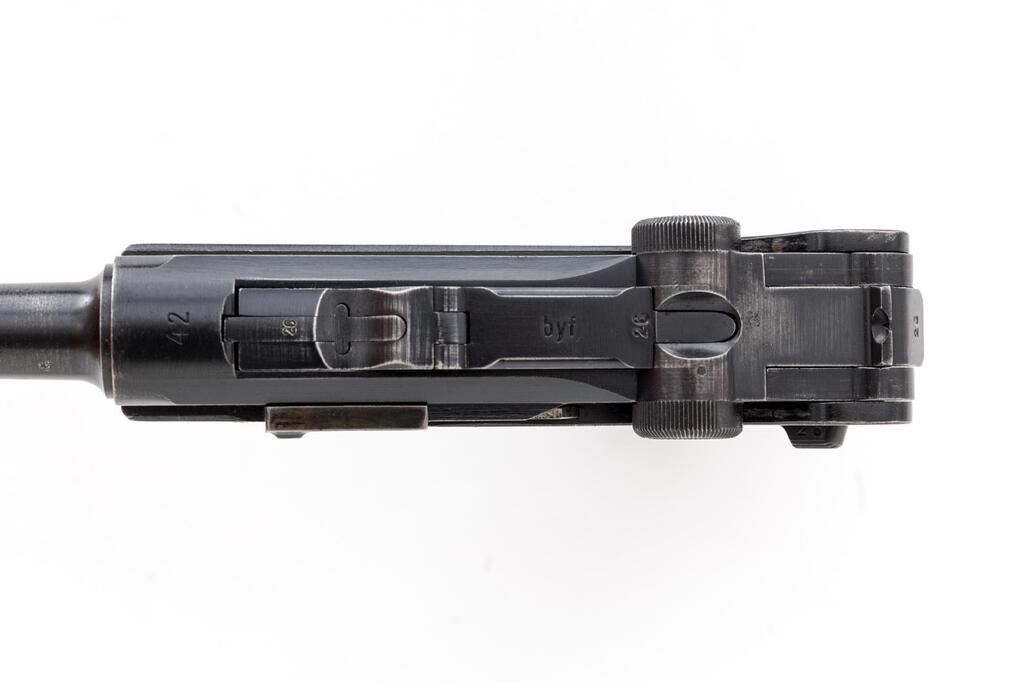 WWII German Luger byf-42 Semi-Automatic Pistol, with Holster, #2326b, 9mm, 4" barrel, blued finish, blued small parts, toggle center link marked "byf", chamber dated "42", Nazi eagle firing proof, "(eagle)135" waffenampts, all visible numbers matching but sideplate has been renumbered and refinished to match; stock lug, checkered wood grips, one blued extruded steel magazine with pinned black plastic base, marked "fxo", "(eagle)37", and "P.08". Includes a brown leather hard shell holster that is unmarked, and an unmarked loading tool. Condition is very good retaining approx. 80% original finish, with wear to the muzzle sides, a couple of heavy scratches on the barrel, high edgewear on the front of the frame, slide, thinning to the top of the toggle assembly, edgewear on the refinished sideplate, and sides of the frame. Right frame ear shows thinning and freckling, front and rear grip straps are very strong with light freckling. The blued small parts are very nice, with wear on the left side of the trigger. Grips are nice showing only light use, with nice grip screws and clean slots. Action, hold open, and safety all function properly; bore is lightly frosted with strong lands and grooves. Magazine shows only light use and is very nice. Holster is unmarked as noted above, and has a dark brown finish with spots of black in a few areas, showing age, wear from use, scuffs, scratches, and light cracking. The internal pull strap is intact. There is no extra magazine in the side pouch. There is an unmarked loading tool in the small internal pouch on the top flap. Est.: $1,000-$1,500. (C&R/PPT)