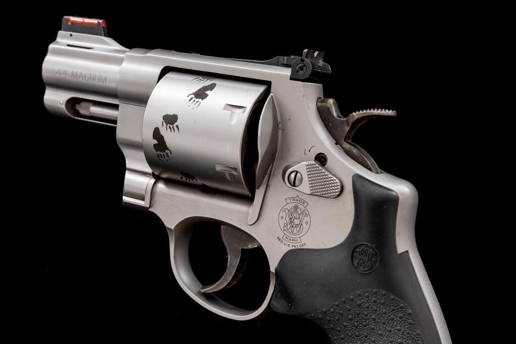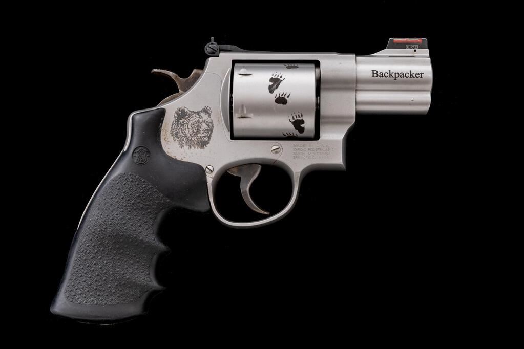 Smith & Wesson Model 629-6 Backpacker Double Action Revolver, #CMK5775, .44 Magnum cal., 2.5" ported barrel, red fiber optic Hi-Viz front and adjustable rear sights, unfluted 6-shot cylinder with embossed bear paw tracks, satin stainless steel finish, Hogue one-piece textured rubber combat grips. In a S&W blue plastic factory case. Production of the Backpacker began in 1994 and has since been discontinued. Pistol is in near excellent condition with light handling marks and some dried oil on the frame that should clean. There is minimal powder burn at the front of the cylinder with a light index line on the cylinder. There is a Grizzly bear depiction on the right side of the frame, with "Backpacker" on the right side of the barrel. Grips are very good and fit well.  Est.: $1,000-$1,200. (Modern/PPT)