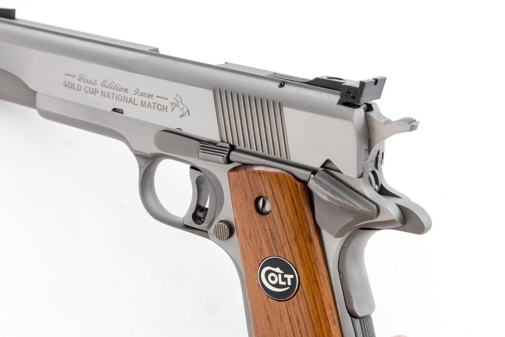 First Edition Colt Gold Cup Semi-Automatic Pistol, with German Proof Marks, #GCNM097, 9mm, 5" barrel, stainless finish, smooth wood grips with Colt medallions, blade front sight, square-notched Elliason rear sight that is adjustable for windage and elevation, skeletonized trigger, with three (3) stainless Colt magazines. Only 500 First Edition pistols were produced, having standard Colt markings; additionally, the left side of the slide is marked "First Edition". This pistol also features commercial German proof marks on the right side of the barrel, frame, and slide. Mfg'd 1989. Includes the original First Edition Colt soft carrying case. Condition is excellent, appearing like new. Frame and slide with only a few insignificant handling marks. Factory lettering is crisp. Grips and action are like new. Bore is bright with strong rifling. Est.: $1,500-$2,000. (Modern/PPT)