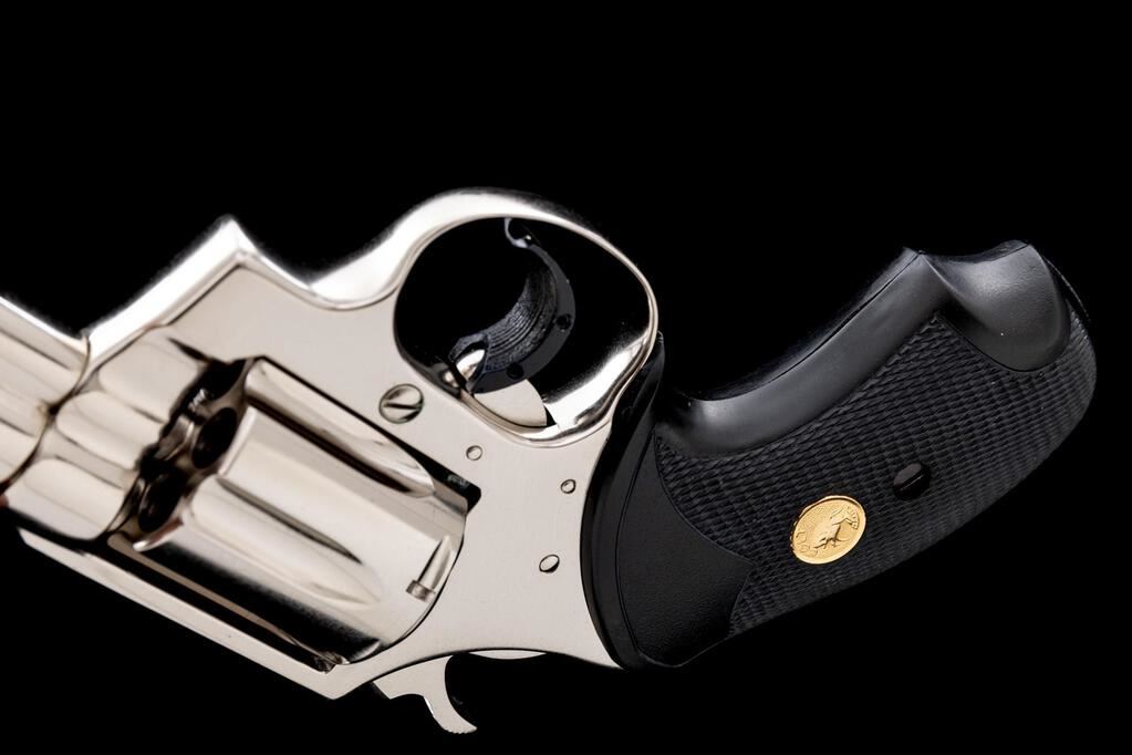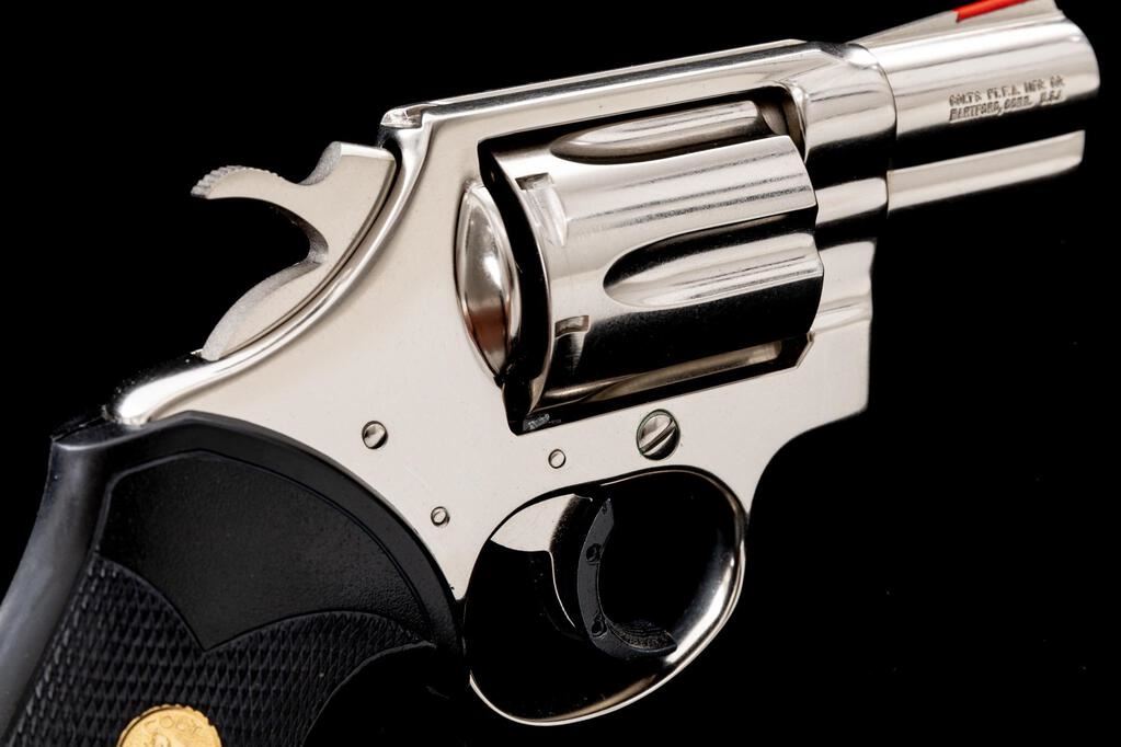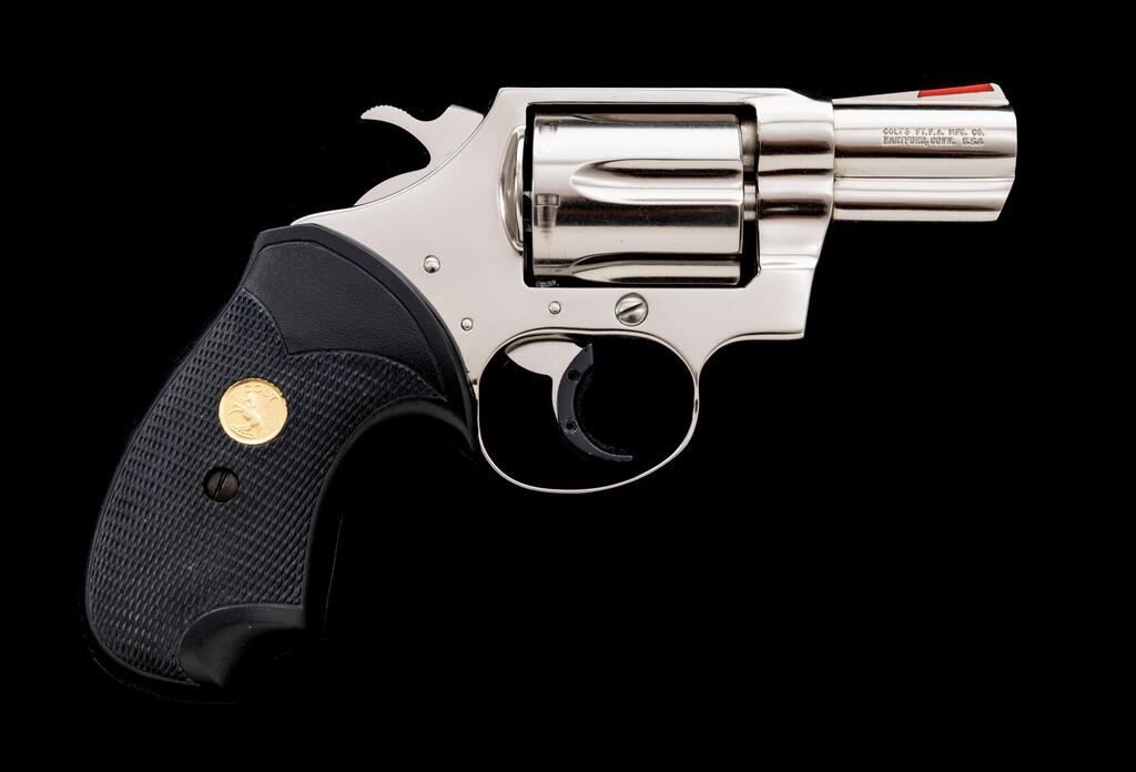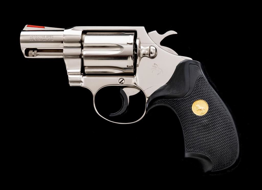 Colt Detective Special Third Issue Double Action Revolver, with Factory Nickel Finish, #S33586, .38 Spec. cal., 2" barrel, checkered black rubber Colt/Pachmayr grips with gold Colt medallions, red ramp front and standard notched rear sights, with added trigger shoe. Mfg'd 1980. Condition is excellent overall. Bright nickel finish has a small amount of slight scratches and normal light handling marks. Grips are like new. Crisp action cycles smoothly and locks up securely. Cylinder face, chambers, and bore are bright, rifling is well-defined. Est.: $800-$1,100. (Modern/PPT)