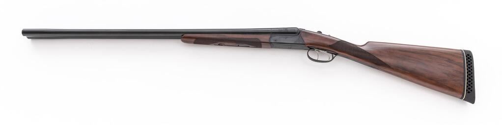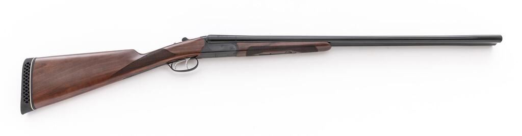CZ Bob White G2 Model Side-by-Side Shotgun, #21C0392. 20 ga. 28" solid rib barrels have 3" chambers and are fitted with choke tubes (5 included). The boxlock action features double underlug lockup, double triggers, non-automatic safety, and plain extractors. The receiver is black chrome finished like the barrels, with moderate scroll engraving. The splinter forend and straight grip cuttstock are of satin-finished Turkish walnut and fitted with a Pachmayr Whiteline recoil pad. Stock dimensions are 14-3/4"x1-3/8"x2-3/8". Gun is contained in a CZ black plastic hard case with extra tubes, wrench, and instructions. Mfg'd approx. 2020 by Huglu in Turkey for CZ. Condition is as new, showing little use. The dark wood is nearly perfect; action locks very tight and functions correctly; bores are bright. Est.: $500-$600. (Modern)