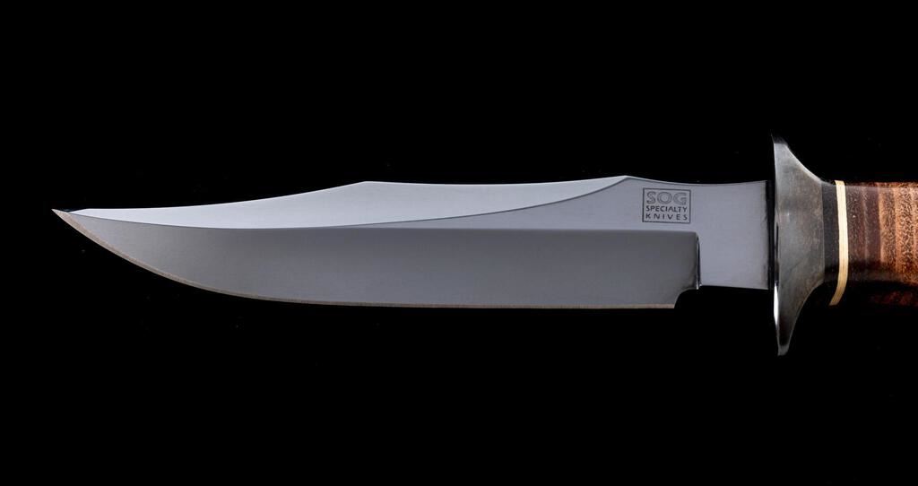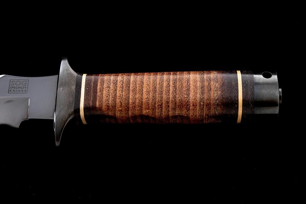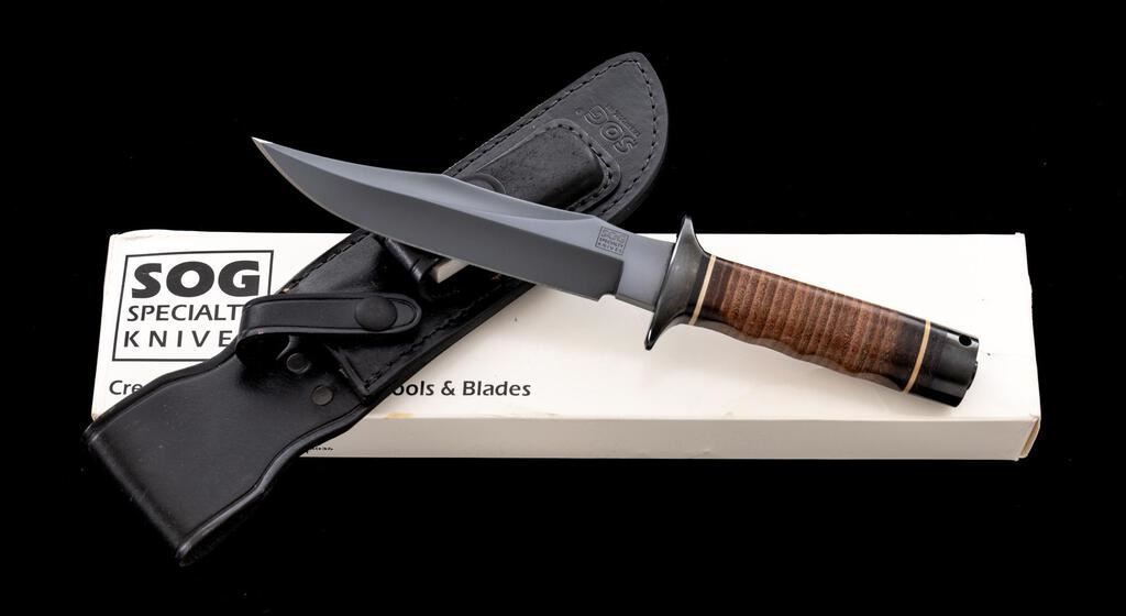 SOG Vietnam 5th Special Forces Group S1 Bowie Knife, 6-3/8" black clip point blade, 11-1/8" overall, stacked leather washer handle with finger grooves, blackened full guard and butt cap. Marked on one side of the blade with SOG logo; opposite side is marked "Seki-Japan", "Vietnam 5th Special Forces Group", and has the Special Forces "De Oppresso Liber" logo. Includes the original black leather SOG sheath, white sharpening stone, and box. Knife is in excellent unused condition. Stacked leather washers, guard, and butt cap show a few light handling marks. Sheath is also excellent with a few light scratches to the belt loop. Box is good, showing some creasing and damage to the corners; end label is clear. Est.: $500-$700.