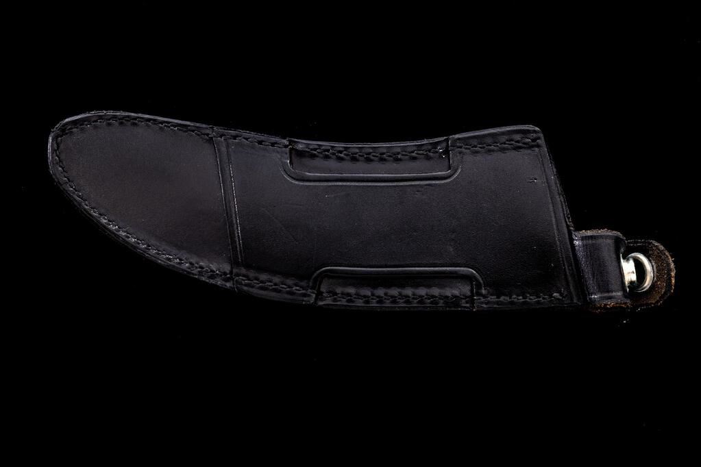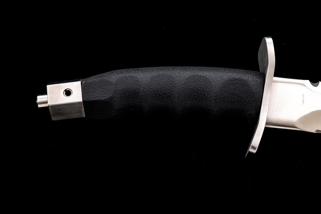 Al Mar Model 3103 Warrior Fixed Blade Knife, Seki-Japan, 7-1/8" blade with serrated top edge, 13-3/8" overall, finger grooved rubber handle with hidden tang, stainless full guard and stainless butt. One side of blade has Al Mar logo, and the other side is marked Seki-Japan. Includes black leather sheath, box, and small "Warriors Edge" warranty card. Knife is in excellent unused condition. There are a few minor handling marks on the blade. Guard and butt show a small amount of light scuffs and scratches. Sheath is near excellent with intermittent small and shallow impressions, no major blemishes. Box shows a little creasing but overall is in very nice shape. Est.: $600-$800.