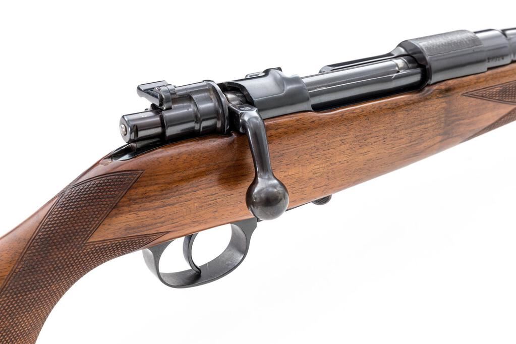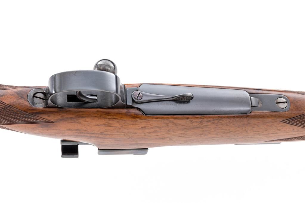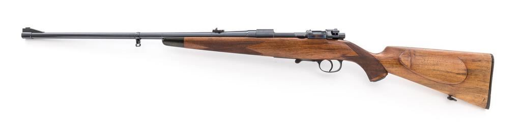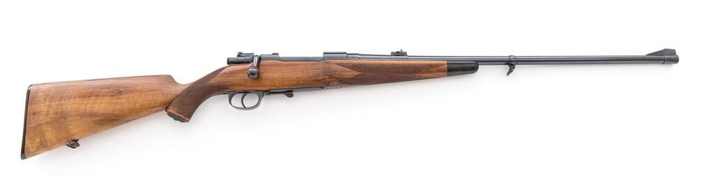 A. Francotte Mauser Bolt Action Sporting Rifle, #19924, 10.75mm x 68mm, 24" barrel, blued finish, top of chamber engraved with a matte finish, two-stage trigger, lever safety, ramp style front sight with removable bead and drift adjustable fixed rear sight with folding leaf for 100 & 200 yards. Barrel engraved "A Francotte a Liege" with caliber, Belgian proof marks, hinged floorplate with locking lever, checkered walnut Monte Carlo stock with cheekpiece, horn end cap, grip cap, and checkered buttplate, sling swivels mounted on barrel and rear of stock. Rare, original condition, having never been fitted with a scope. Condition is excellent retaining approx. 97% original blued finish, with wear lines from use on the bolt body, fading and light scratches on the bolt release lever spring, wear to the finish on the front action screw head, light wear and scratches on the floorplate, and light freckling on the bottom of the trigger guard. Action and safety work properly, bore is bright with light soiling which may clean to excellent. Stock is excellent with only one tiny ding near the buttplate on the left side, one or two tiny scratches, and crisp checkering. Horn buttplate shows minor insect damage, freckling, and wear to the finish on the screws. Overall, a beautiful gun showing only light use. Est.: $2,500-$4,000. (C&R)