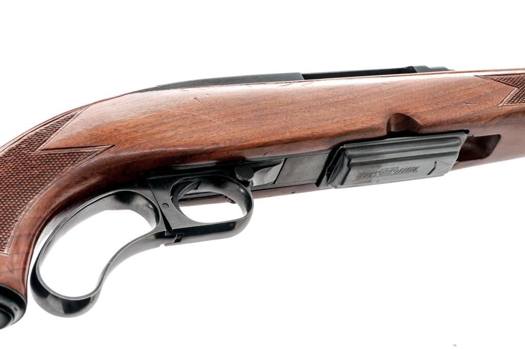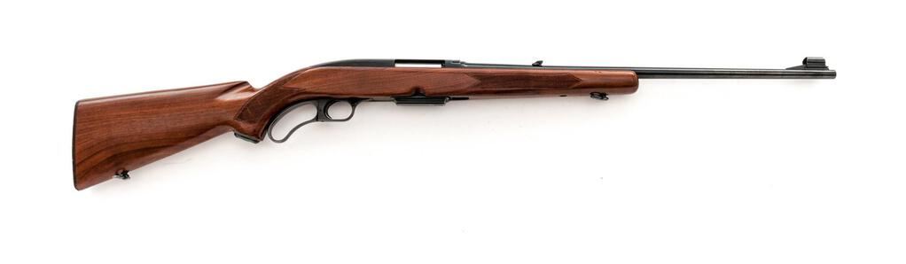 Winchester Model 88 Lever Action Rifle, #147275A, .243 Win. cal., 22" barrel, hooded ramped blade with steel bead front and folding rear sights, blue finish, checkered walnut one-piece pistol grip stock with sling swivels and a checkered plastic buttplate, with 4-rd. detachable box magazine. Mfg'd 1963. Rifle is in near excellent overall condition retaining approx. 96%-98% factory finish, showing light handling marks only. Receiver is factory drilled and tapped for scope mounting and for an aperture sight. There are crisp Winchester "WP" proof marks on the barrel and front ring. Checkered walnut stock is very good + with small mars and handling marks. A checkered plastic buttplate provides a 13-7/8" LOP. Action is crisp, bore is very good. Est.: $800-$1,200. (C&R)