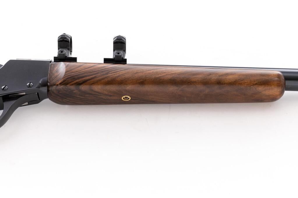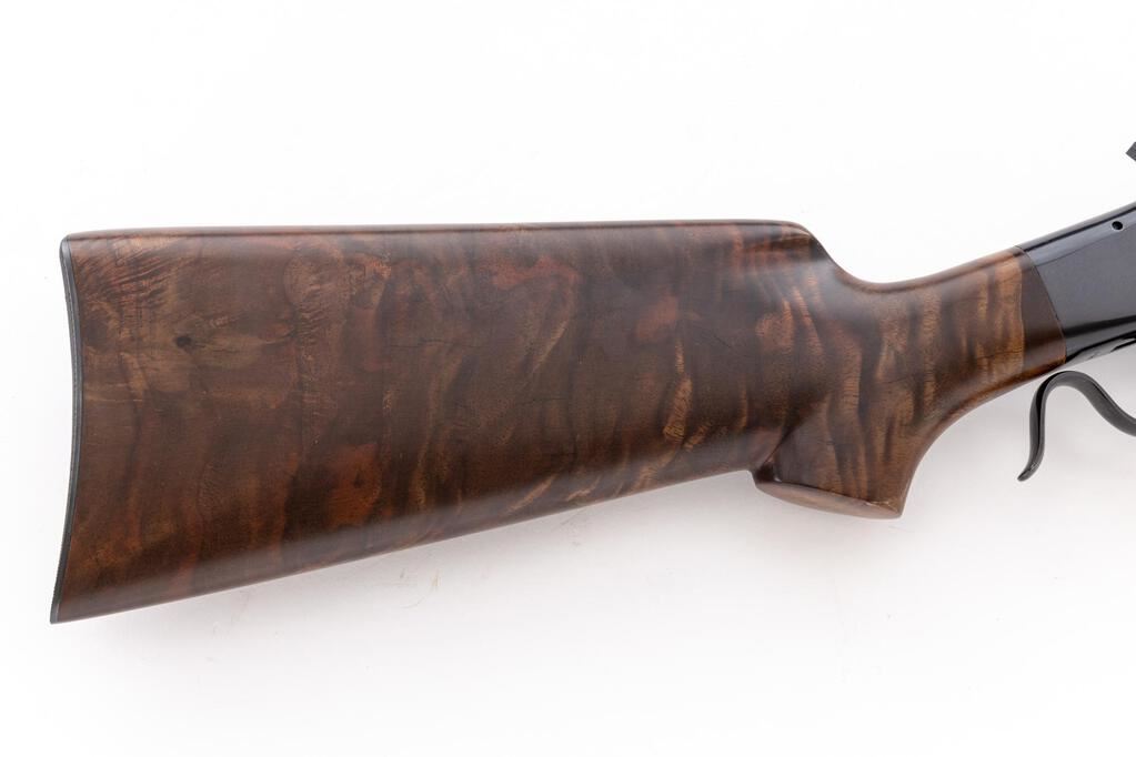 Custom Falling Block Works Model J Single Shot Rifle, #J546, .45-70 cal., 27" heavy barrel without sights, barrel is drilled and tapped for scope base, blue finish, custom Exhibition Grade fancy walnut two-piece pistol grip stock with a beaded cheekpiece and checkered steel buttplate. Topped with Weaver two-piece bases and rings. Left side of receiver is marked "FALLING BLOCK WORKS MAYBEE, MICH." Rifle is in near excellent overall condition retaining approx. 96%-98% blue finish with handling marks only. Custom stock is in near excellent condition with outstanding figure, fit and finish; checkered steel butt plate provides a 14" LOP. Bore is very good with defined rifling, and action locks up tight on this interesting custom Falling Block in the venerable .45-70 chambering. Brothers Leo and Joe Fix operated FBW out of Troy, Michigan, producing a variety of custom Falling Block actions until ceasing operation in the early 1990's. Est.: $1,000-$1,400. (Modern)