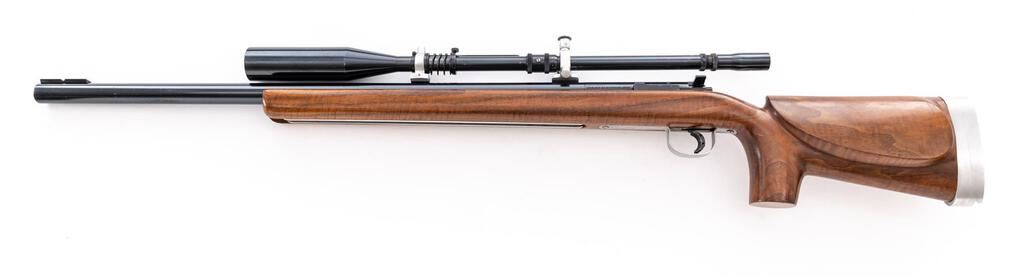 Custom Erma Deutsches Sportmodell Single Shot Bolt Action Rifle, with J.W. Fecker Scope, #10324, .22 LR cal., replacement 28" heavy barrel is unmarked as to the mfg'r. One-piece pistol grip target stock with cheekpiece, adjustable aluminum buttplate, forend with inlaid aluminum accessory channel. Buttstock is missing the adjustable pad that fits into the dovetailed slot. Barrel has a sight block mounted at the muzzle and two rear blocks for scope mounting. Right rear portion of the receiver is drilled and tapped, stock is notched for a sight. Topped with a J.W. Fecker 16x1-5/8" target scope with recoil spring, and aluminum J.W. Fecker mounts. Scope has a blue finish, fine crosshair reticle, and threaded aluminum covers; overall length is 25 7/8". Matching numbered bolt, with standard "(crown)B" and "(crown)U" proof marks. Trigger with added shoe; trigger pull is approx. 1.5 lbs. Length of pull to end of wood is 11.5"; 13" to end of aluminum buttplate. Weight with the scope is approx. 15 lbs. Condition is very good as configured retaining approx. 95% blue with light scratching and thinning to the barrel. Factory lettering on the receiver is clear. Stock has scattered surface dents and scratches. There is one deeper impression to right side of the forend, and the edge is chipped at the receiver sight cutout. Action is crisp and operates smoothly; bore is bright with well-defined rifling. There are minor blemishes visible on the outside of the scope; optics are clear except for a few small dark specks around the perimeter. Est.: $1,200-$1,800. (C&R)