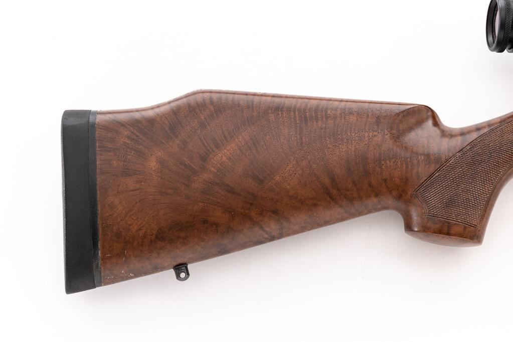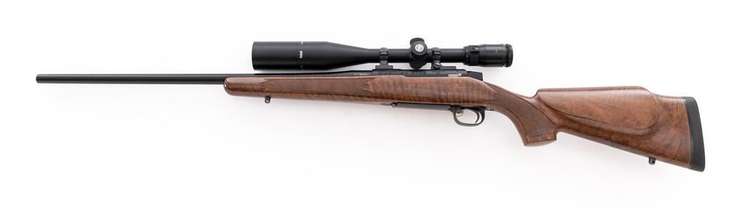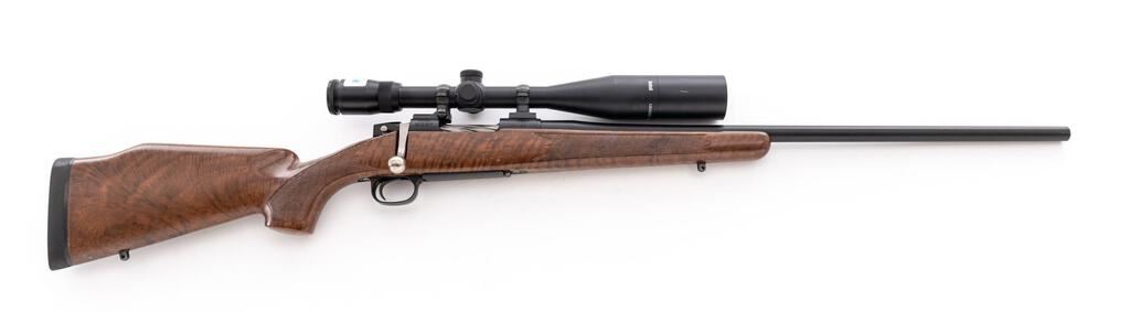 McMillan Bros. MCRT Bolt Action Rifle, with Bushnell Scope, #SS-183, 6.17 Spitfire cal., 24" Sporter barrel is unmarked except for caliber, metal with a dark blue finish. Pistol grip wood grain pattern fiberglass stock with point checkering, slight right-hand palm swell, Monte Carlo comb, cheekpiece, solid black rubber Decelerator recoil pad, and sling swivel studs. Barrel was mfg'd without sights. Topped with a Bushnell Legend Ultra-HD 4.5-14x44mm scope. Scope has a matte black finish, Mil-Dot reticle, and sunshade. Metal surfaces rate in excellent overall condition retaining approx. 97% finish, with light scratches and edgewear to the trigger guard and floorplate. Stock is very good with scattered light scratches, handling marks, cheekpiece edgewear. Action is crisp and operates smoothly, bore is mirror bright with strong rifling. There are light scuffs and minor blemishes visible on the outside of the scope, optics are bright and clear. Includes an RCBS 6.17 Spitfire full-length resizing die and seating die, and an additional Bonanza 7mm Remington full-length sizing die. Est.: $1,800-$2,400. (Modern)