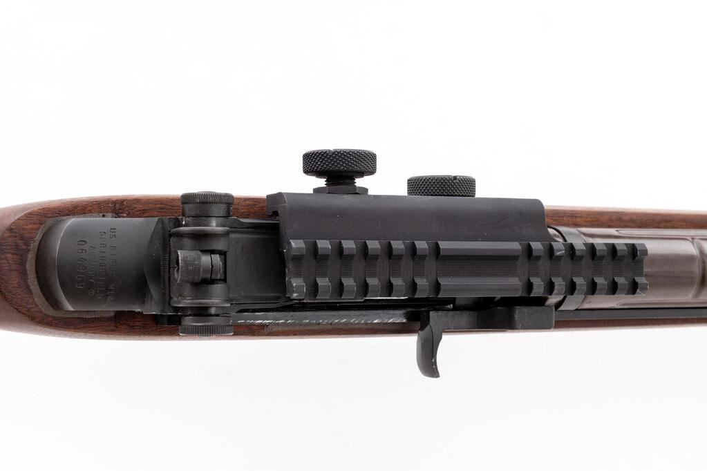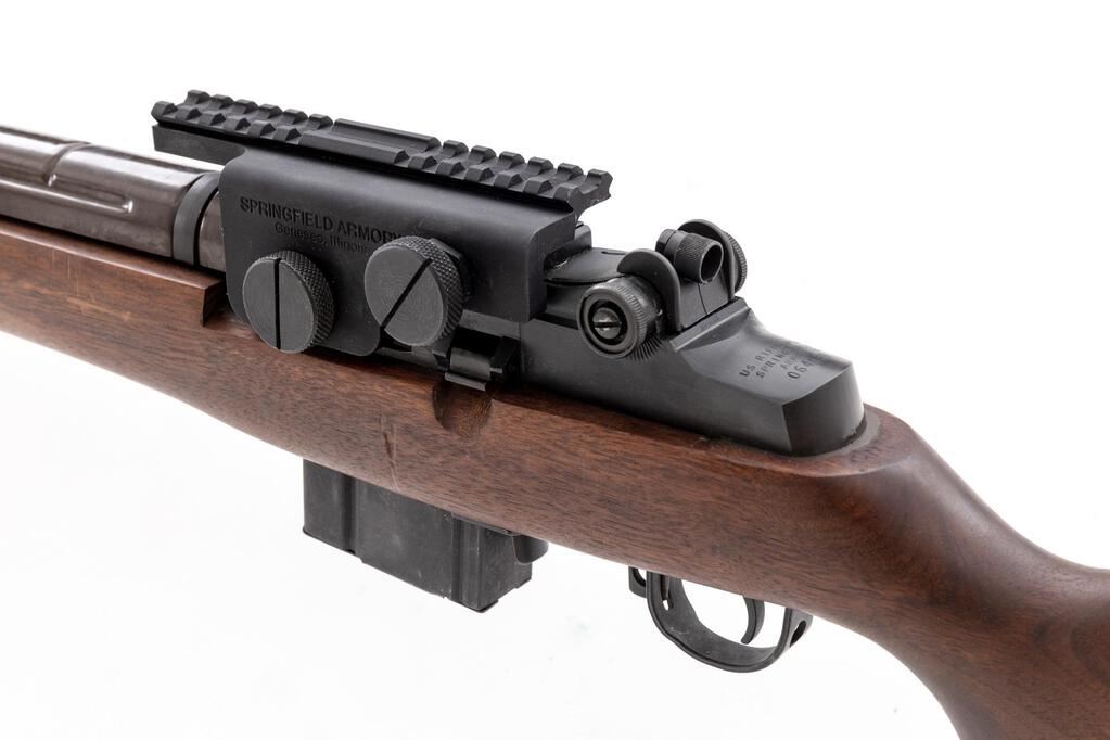 Springfield Armory M1A Semi-Automatic Rifle, #064969, .308 Win. cal., 22" barrel with muzzle device, parkerized finish, walnut target style stock with fiberglass hand guard, blade front sight with protectors and adjustable aperture rear sight with National Match hood. A Springfield Armory marked rail scope mount is installed, and the installation instructions and removed charger clip guide are included in a Springfield Armory labeled plastic box, all in very good condition. One unmarked very good condition 10-rd. magazine is also included. Rifle stock has been bedded and the compound is visible around the receiver. Condition overall is very good with the metal retaining approx. 95% finish, showing a few light handling marks. There are areas of marring to the left side of the forend. Stock is otherwise very good with an even colored finish. The hand guard is in excellent condition. Action operates smoothly, bright bore is excellent with well-defined rifling. Est.: $1,500-$1,800. (Modern)