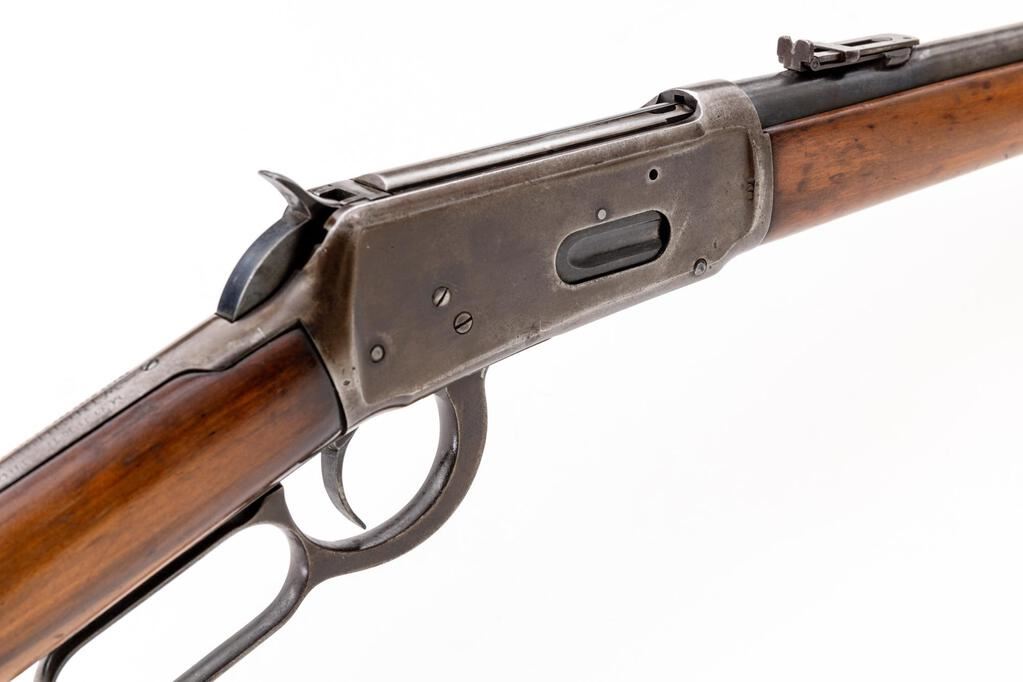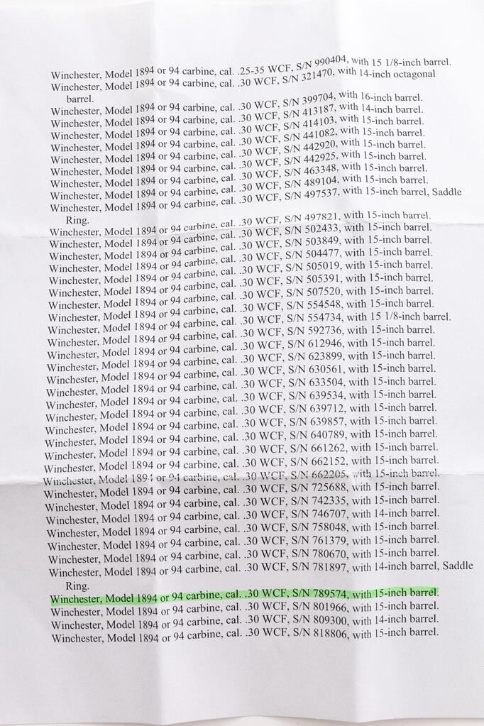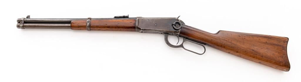 Very Rare Winchester Model 1894 "Trapper" Saddle-Ring Carbine, #789574, .30 W.C.F. (.30-30) cal., 15" round barrel, tall pinned blade front sight and ladder rear, marked with maker's name, address and 1894 patent date ahead of band, "Nickel Steel Barrel/Especially for Smokeless Powder" and caliber at breech; receiver has standard features and markings, saddle ring at left. Oil-finished walnut stocks, carbine buttplate. Mfg'd 1915. Condition is good retaining traces of barrel blue, 15% receiver blue, else smooth gray gunmetal with fine edges and markings. Stocks are sound and smooth having been sanded with finish added. Action is crisp, bore is bright with moderate frosting and sharp rifling. A rare and desirable Trapper carbine. (Rifle is listed by serial number as being removed from NFA and classified as C&R.) Est.: $3,500-$5,500. (C&R)