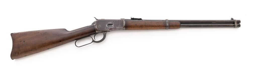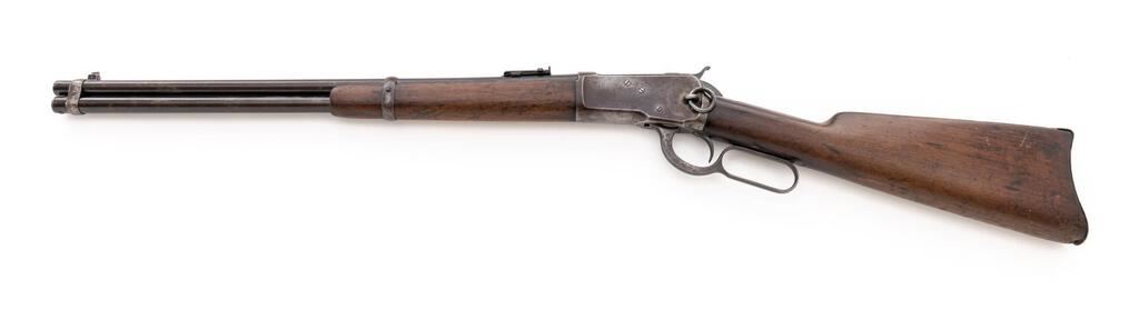 Canadian Proofed Winchester Model 1892 Saddle-Ring Carbine, #744010, .44 WCF (.44-40) cal., 20" round barrel, standard sights, (crown)(crossed flags)DCP" proof mark at breech, oil-finished walnut stocks with curved buttplate.  One of approx. 20,000 Model 1892 Carbines in 44 WCF that were approved by Canadian inspectors on behalf of the British government for use during WWII.  Mfg'd 1913.  Condition is good retaining approx. 20% barrel/mag blue, else lightly oxidized gray gunmetal having fine edges and markings.  Stocks are sound showing typical marks of age and use, buttstock with 1" crack at right frame, .75" chip at toe.  Action is crisp, bore shows moderate erosion and good rifling.  Est.:  $1,500-$2,500. (C&R)