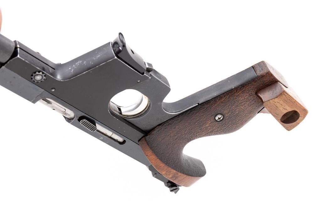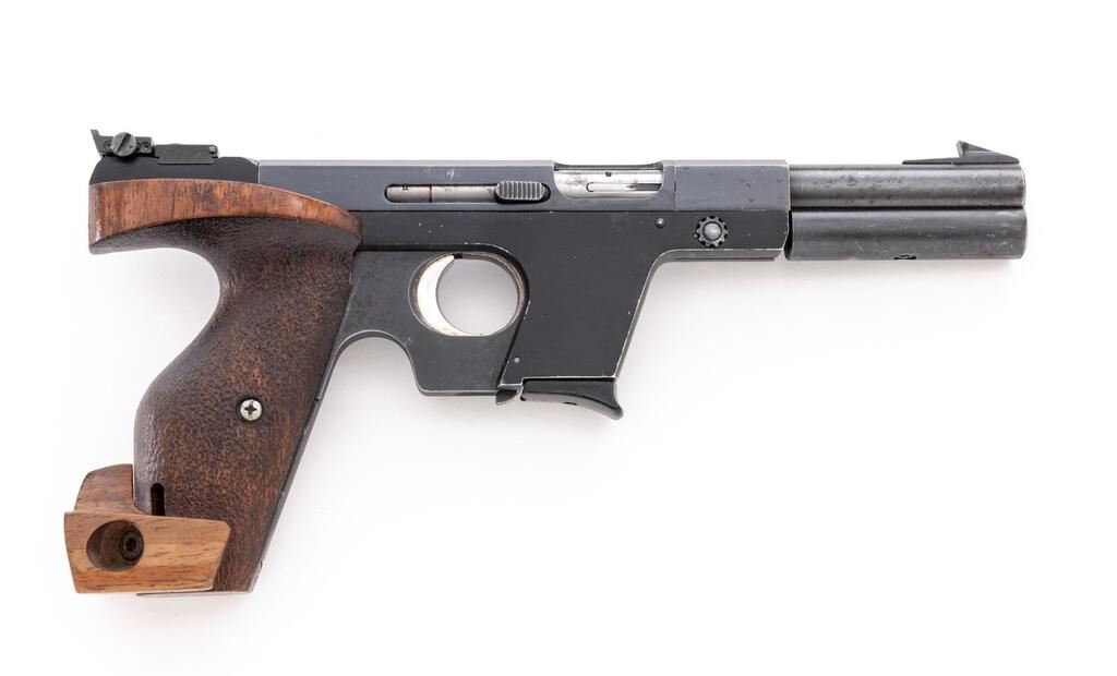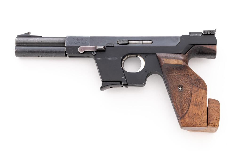 Walther OSP Semi-Automatic Target Pistol, #03743, .22 Short cal., 4.25" barrel, blue finish, black alloy frame, right-hand target grips with adjustable heel shelf, blade front and fully adjustable rear sight, with barrel weight, and one Walther magazine. Left side with German proof marks and "66" date code. Condition is very good, showing handling marks and range use. Approx. 90% metal finish remains, with scattered scuffs and scratches, primarily on the barrel and barrel weight. There are a few tiny specks of oxidation on the upper portion of the frame. Grips show some oil darkening and general handling wear, no major blemishes. Action operates smoothly. Bore appears excellent, is bright with well-defined rifling. Est.: $600-$800. (C&R)(On Calif. roster of exempted Olympic competition pistols.)