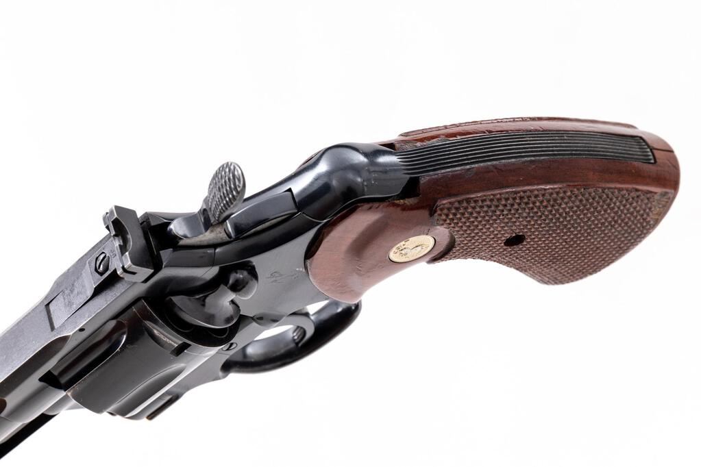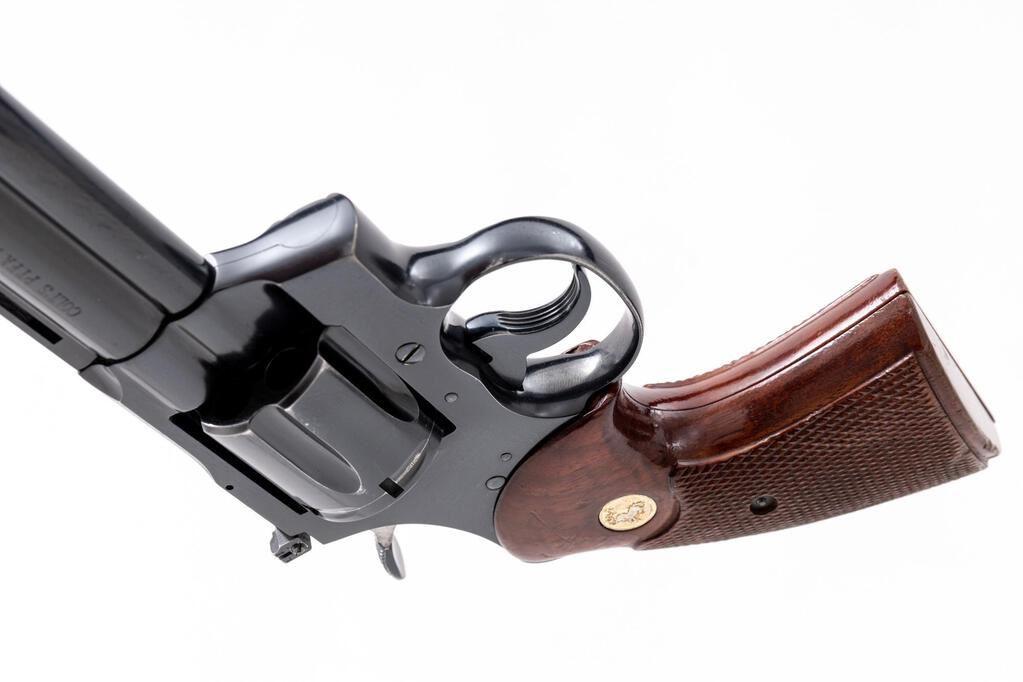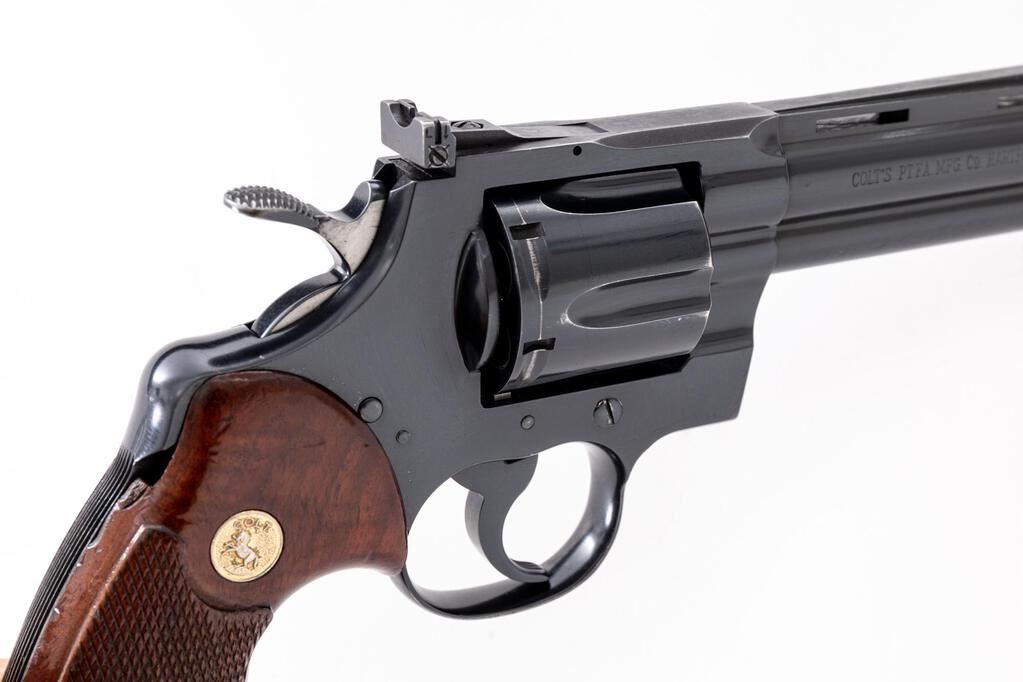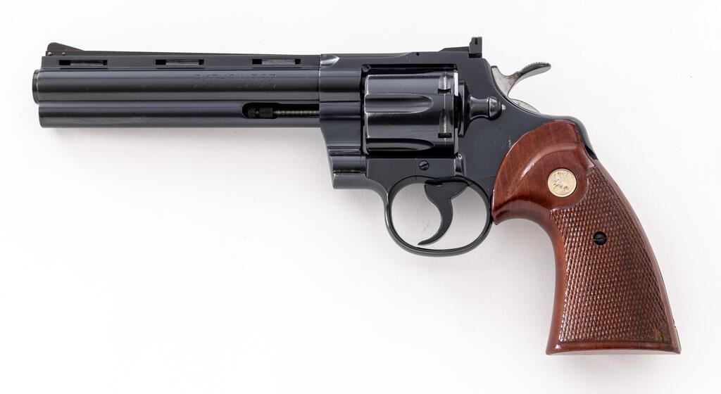 Colt Python Double Action Revolver, #66755, .357 Mag. cal., 6" vent rib barrel, blue finish, checkered walnut grips with gold Colt medallions, ramped front sight, and fully adjustable square-notch rear sight. Mfg'd 1967. Metal surfaces rate in fine overall condition and retain approx. 93% factory blue. Wear at the muzzle, highpoints of the cylinder, and edges of trigger guard account for much of the finish loss. There is some light scratching and a moderate turn line visible on the cylinder. Grips are serviceable but in fair condition. Left grip has a noticeable gouge to the bottom back corner; there are visible gaps on back edge, below the frame, as the grips appear to have been modified. Front corner of the grip frame under the grips has been shaved off, possibly for use with a different pair of custom grips. Action cycles smoothly and locks up securely. Bore is very good, bright with clear rifling. Overall, a nice shooter grade Python. Est.: $1,600-$2,200. (C&R/PPT)