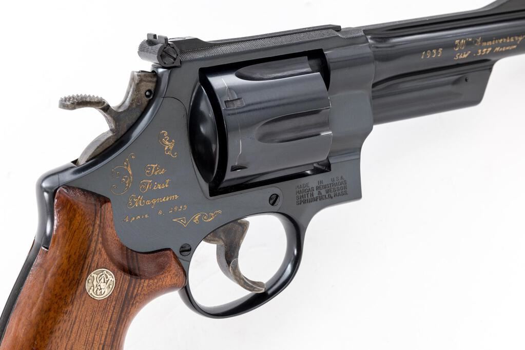 Smith & Wesson Model 27-3 Commemorative .357 Magnum 50th Anniversary Double Action Revolver, #REG0470, .357 Mag. cal., 5" barrel, blue finish, smooth Goncalo Alves target grips, ramped blade front sight and square-notched rear sight that is adjustable for windage and elevation, color case hardened target trigger and target hammer. Revolver features standard factory lettering, additionally the right side of the frame is marked in gold "The First Magnum April 8, 1935"; right side of the barrel "1935 50th Anniversary S&W .357 Magnum 1985". Includes the original matching numbered box with sealed cleaning kit and screwdriver, protective S&W paper, instruction manual, and misc. factory paperwork. In original wood presentation case with fitted blue interior, certificate, brass plaque inlaid into lid, and key. One of 2,500 mfg'd in 1985. Revolver is in excellent overall condition and retains approx. 98%+ factory metal finish. There is a thin turn line to the cylinder and a few minor scratches to the cylinder face. Factory lettering is crisp. Case colors are strong. Grips are like new. Excellent action and bore. There are intermittent scratches to the outside of the wood case, interior is excellent. Box is in very good condition showing only light storage type wear. The label has become detached from the end panel and is now affixed to the inside of the lid. Est.: $1,000-$1,500. (C&R List/PPT)