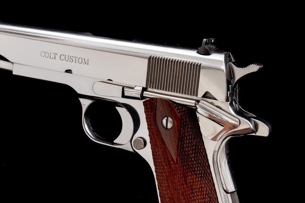 Colt Custom Shop Government Model .38 Super Semi-Automatic Pistol, #ELCEN2456, .38 Super cal., 5" barrel, bright stainless finish, checkered double diamond rosewood grips, white 3-dot sight configuration, with one bright stainless Colt magazine. Left side of slide is marked "COLT CUSTOM". In two-piece Custom Shop box, white exterior cardboard box with matching numbered end label, orange hang tag, cable lock, instruction manual, and misc. factory paperwork. Mfg'd 2001. Condition is excellent. Frame and slide with intermittent slight handling marks. Grips are like new with sharp checkering. Smooth action, bright bore with strong rifling. Internally very clean, appears unfired. Est.: $2,000-$2,500. (Modern/PPT)