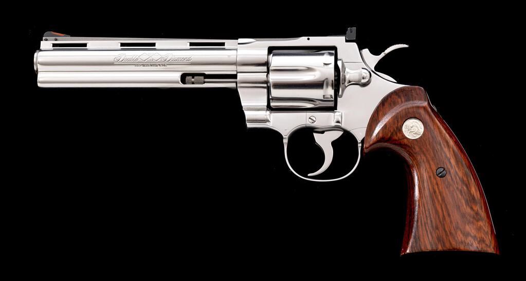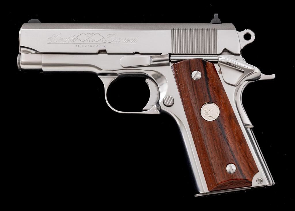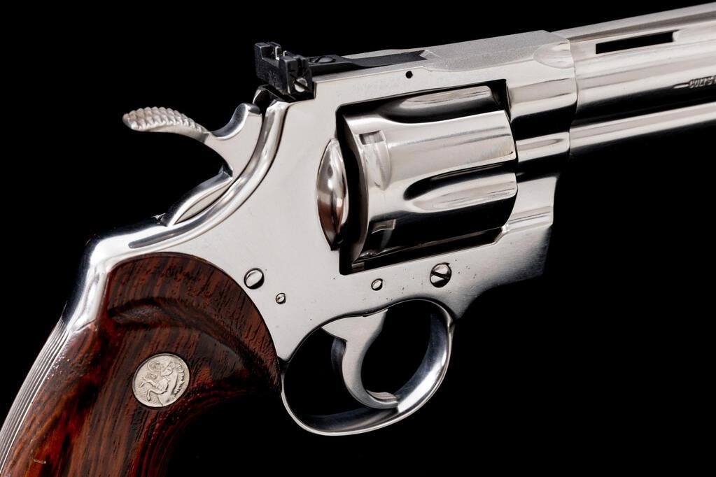 Scarce Colt Double Diamond Matched Set with German Proof Marks, Presentation Case and Boxes. This 150th Anniversary set was limited to a production of only 1,000 and includes both a Colt Python revolver and Officer's ACP pistol. 1.) Colt Python Double Action Revolver, #DD0482, .357 Mag. cal., 6" vent rib barrel, "Ultimate" bright stainless finish, rosewood grips with silver 150th Anniversary Colt medallions, red ramp front sight, and fully adjustable square-notch white outline rear sight. Left side of barrel is marked "Double Diamond" and has a small German "(eagle)N" proof mark. There are also German proof marks stamped on the inside of the frame above the serial number and back of the cylinder. Condition is near excellent retaining approx. 99% factory bright stainless finish, which shows light scratching primarily on the frame. There are also other handling marks that are consistent with those found on a bright stainless finish. Right side, lower portion of the frame has a few tiny specks of finish loss that are likely due to being stored in the display case. Factory lettering is crisp. Grips are excellent overall; right grip has a few light handling marks. There is very faint turn line on the cylinder, mild burn rings on the face, around every other chamber. Bore is excellent. 2.) Colt Officer's ACP Semi-Automatic Pistol, #0482DD, .45 ACP cal., 3.5" barrel, bright stainless finish, smooth rosewood grips with silver 150th Anniversary Colt medallions, white 3-dot sights, with one stainless Colt magazine. Left side of slide is marked "Double Diamond". German proof marks are located on right side of the barrel, frame, and slide. Condition is excellent. Showing intermittent light handling marks, the largest are on the front grip strap. Moderate rub marks to exposed portion of the barrel at the chamber. Factory lettering is crisp. Grips appear like new. Excellent action and bore. Both firearms come with their original matching numbered boxes, instruction manuals, and other misc. factory paperwork. Both boxes show moderate storage type wear and have clear end labels. Glass-topped wood Colt presentation case with black interior, includes the key and 150th Anniversary Colt medallion mounted to the inside. Case interior is excellent; exterior has a few shallow scratches and impressions. Est.: $7,500-$9,000. (Modern/PPT)