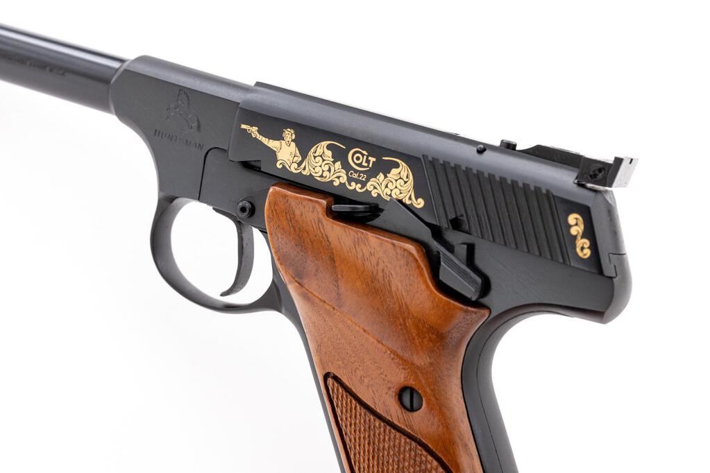 Scarce Cased Colt Huntsman Model S Master Series Semi-Automatic Pistol, #317486S, .22 cal., 4.5" barrel, blue finish, with gold etched slide. Right-hand walnut grips with checkered grip panels; blade front sight and square-notched fully adjustable Elliason rear sight. Includes one Colt magazine. In original wood grain pattern Colt box, matching numbered Colt Custom Gun Shop label has become detached but is present, with instruction manual and misc. factory paperwork. In original Colt Custom Shop walnut display case with blue French-fitted interior and key. There is a plaque mounted to outside of the lid that reads "Model S / Master's Edition / 1 of 400." Approx. 285 were mfg'd like this example with a non-tapered Huntsman barrel. Pistol is in excellent overall condition, appearing unfired, with a few minor handling marks to the front strap. Grips are also like new with crisp checkering. Smooth action, mirror bright bore. One of the box end panels is torn and repaired with tape, otherwise showing normal light storage type wear, and some additional writing in pen. Wood case interior is like new. There are a few shallow scratches present on the outside of the lid. Est.: $1,500-$1,800. (Modern/PPT)
