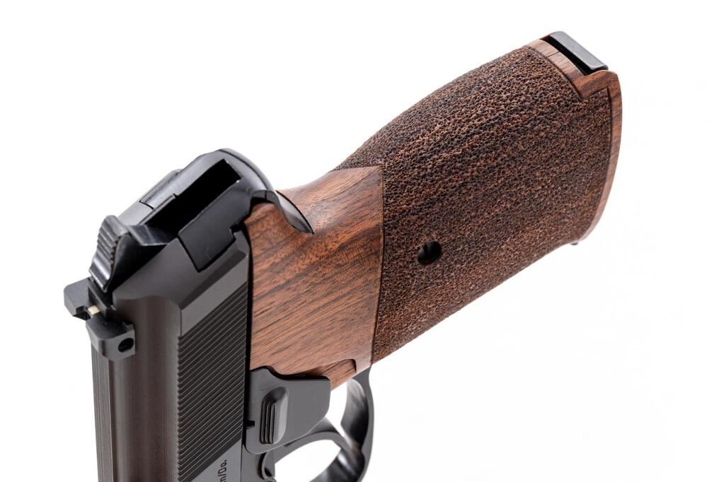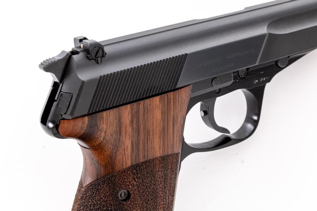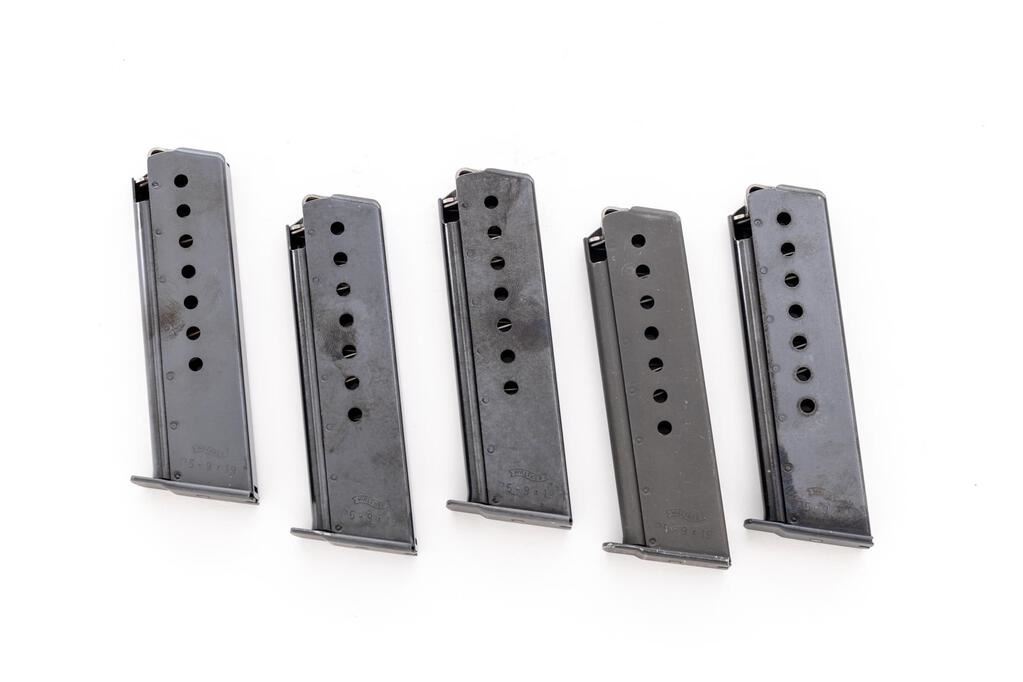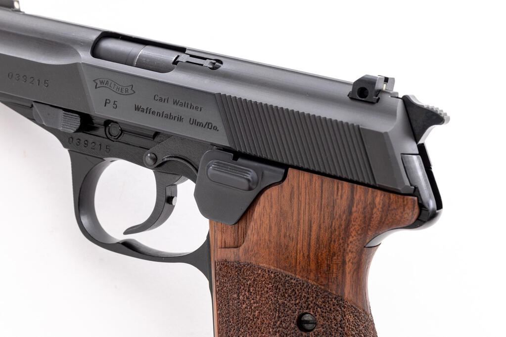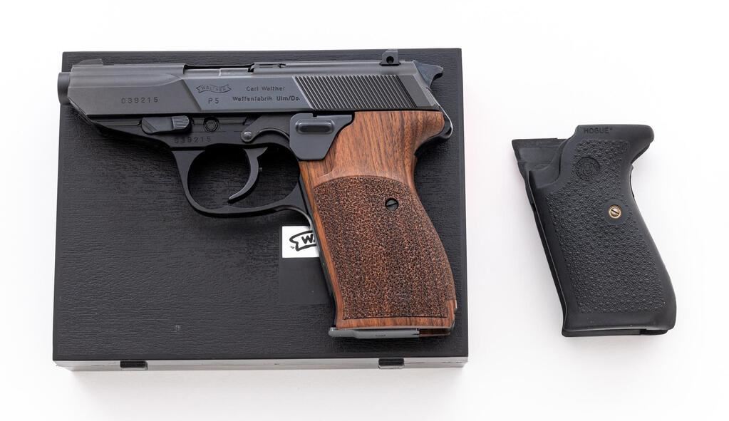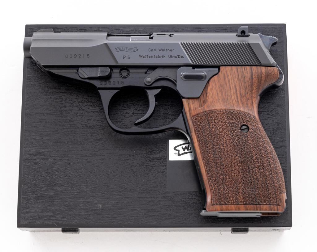 Excellent Walther Model P5 Semi-Automatic Pistol, #039215, 9mm, 3.5" barrel, blue slide, black alloy frame, left side ejection, blade front sight with white dot and square-notched rear sight, with decocking lever. Replacement two-piece walnut Nill-Griffe grips with textured grip panels. Right side of slide is marked "Interarms, Alexandria, VA" and "Made in Germany". Includes four (4) 8-rd. blued steel Walther magazines; one (1) additional Walther magazine, body has a phosphate finish. Mfg'd 1984. In the original matching numbered black plastic Walther case, with cleaning rod, instruction manual, matching numbered test target, and an additional pair of black rubber Hogue grips. Condition is excellent, appearing like new, and retaining approx. 99% factory metal finish. Nill-Griffe grips are also like new. Smooth action, mirror bright bore with crisp rifling. Est.: $1,800-$2,400. (Modern/PPT)