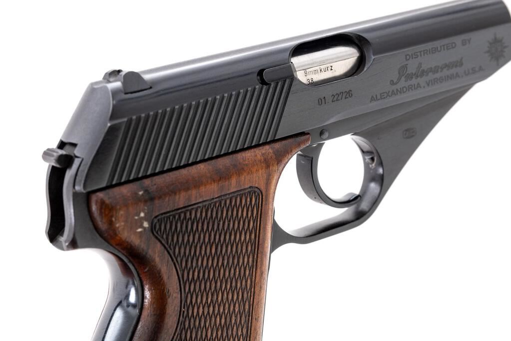 Post-War Mauser HSc Semi-Automatic Pistol, #01.22726, .380 ACP cal., 3.25" barrel, blue finish, checkered wood grips, small blade front and square-notched rear sight, with one Mauser magazine that has a black plastic finger extension. In an original blue vinyl covered box with instruction manual and matching numbered test target. Condition is excellent retaining approx. 97%-98% factory blue, with losses to edge of the trigger guard and minor edgewear to lower front portion of the slide. Grips show only light handling wear. Action operates smoothly; bore is excellent, mirror bright with sharp rifling. Exterior of the blue case shows only typical mild storage type wear. Est.: $500-$700. (Modern/PPT)
