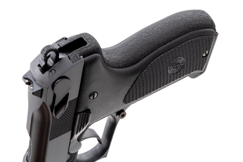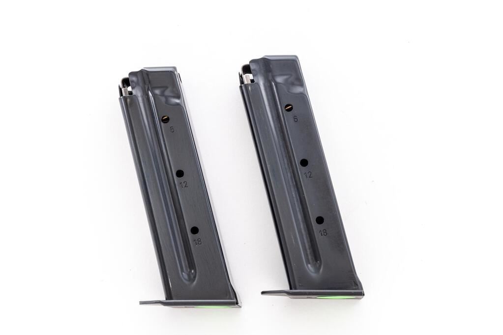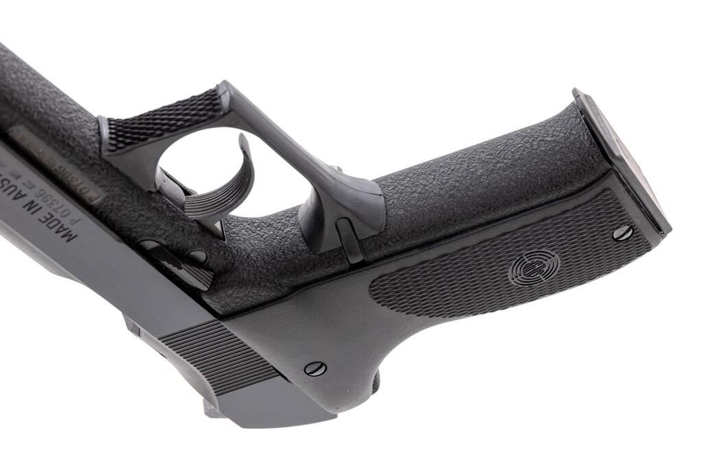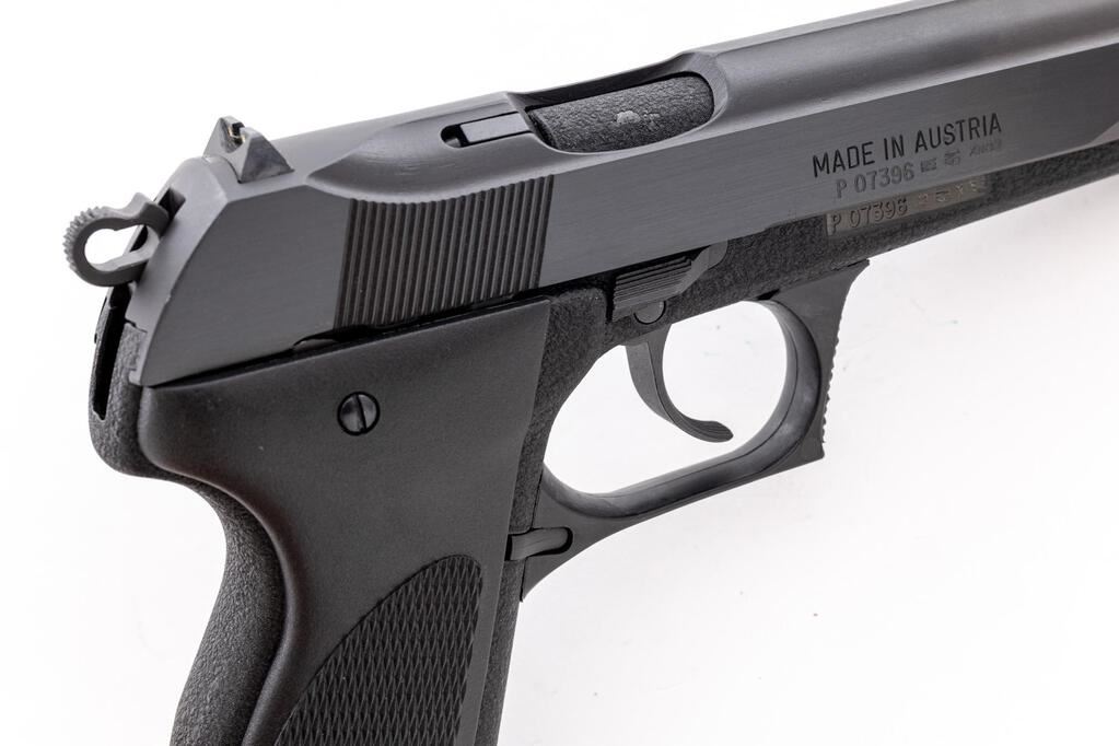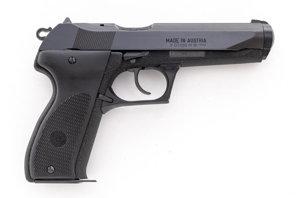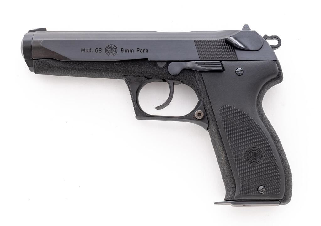 Steyr Model GB Semi-Automatic Pistol, #P07396, 9mm, double/single action, 5.25" barrel with polygonal rifling, blue finish, textured frame, checkered black plastic Steyr grips, white 3-dot sights, and decocking lever. Mfg'd 1982. Includes three (3) 18-rd. magazines, instruction manual, and cleaning accessories. Condition is excellent retaining approx. 98% factory metal finish, with a few slight handling marks. Small spot of textured finish has flaked off of barrel at the ejection port. Grips appear near new with a few insignificant handling marks, checkering is sharp. Action operates smoothly, mirror bright bore. Overall appears little used. Est.: $800-$1,200. (Modern/PPT) (Hi-cap mags not available to Calif. residents.)
