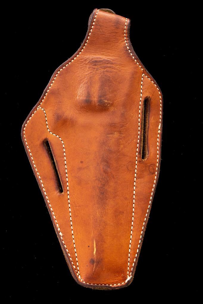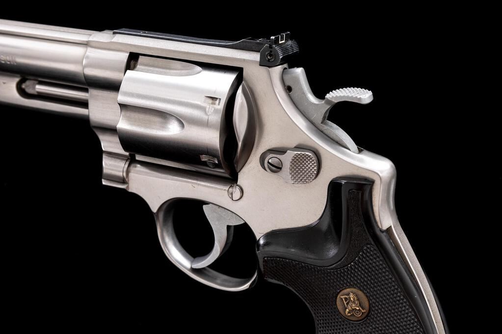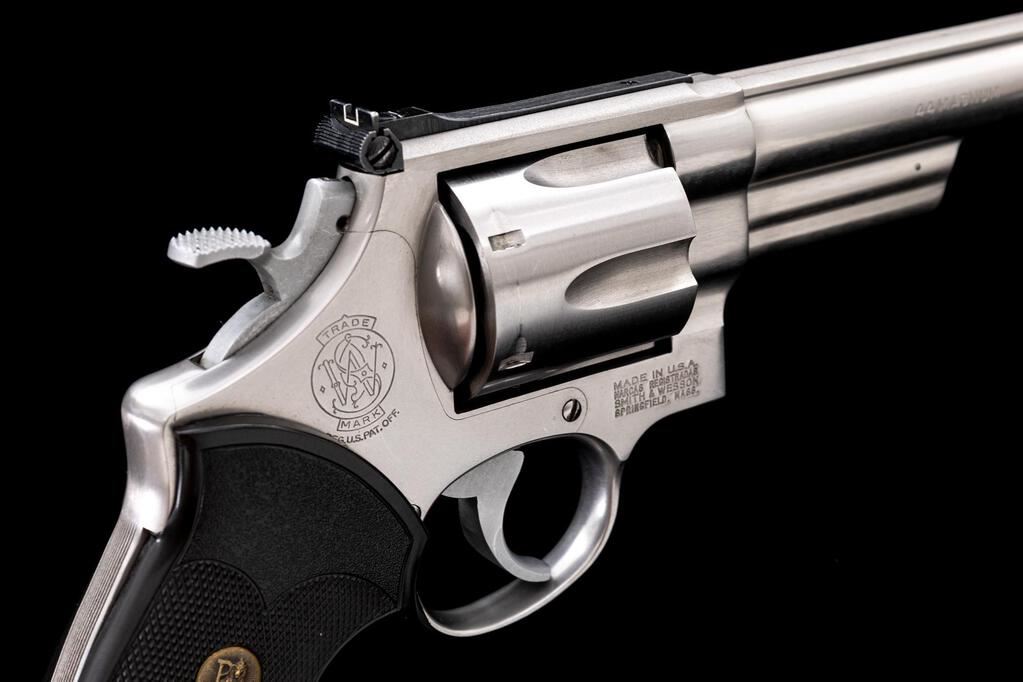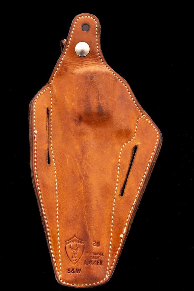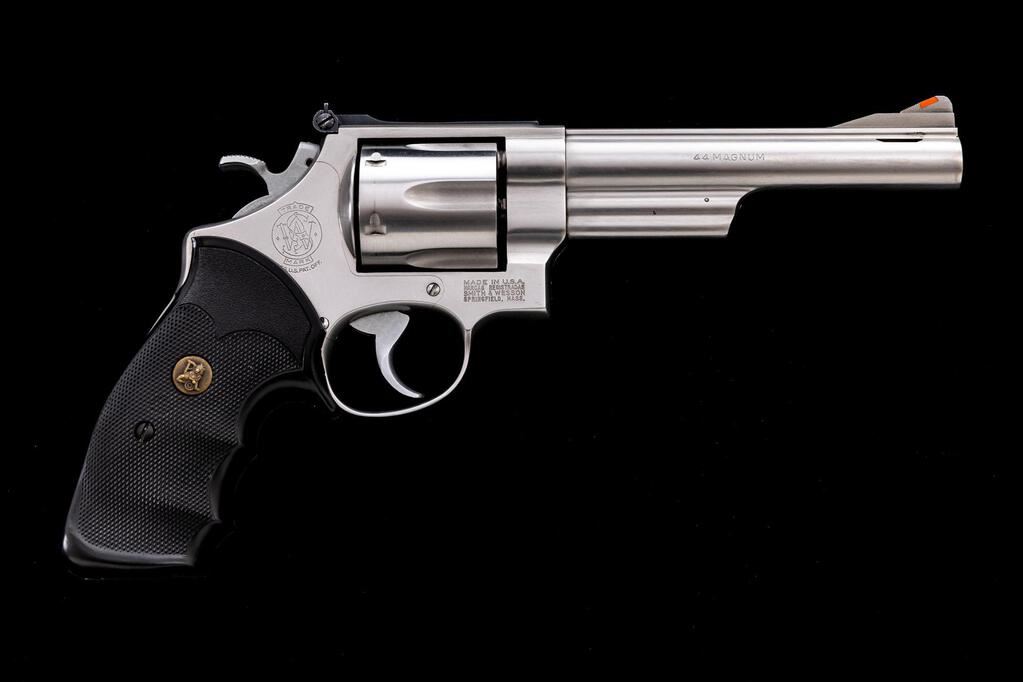 Smith & Wesson Model 629-1 Ported Double Action Revolver, #AVY9608, .44 Mag. cal., 6" ported barrel, satin stainless finish, checkered black rubber Pachmayr grips, red ramp front sight and fully adjustable square-notched with white outline rear sight, smooth target trigger and checkered target hammer. Includes a right-hand brown leather Safariland holster. Condition is very good+ overall, showing signs of moderate use. Metal with scattered light scuffs and scratches. Grips are excellent but do not fit properly, leaving a portion of the backstrap visible. Action cycles smoothly, trigger pull is crisp, cylinder with a little rotational movement; near excellent bore, bright with well-defined rifling. Holster shows moderate age and wear, with some scuffs, scratches, and darkening to the leather. Est.: $900-$1,200. (Modern/PPT)