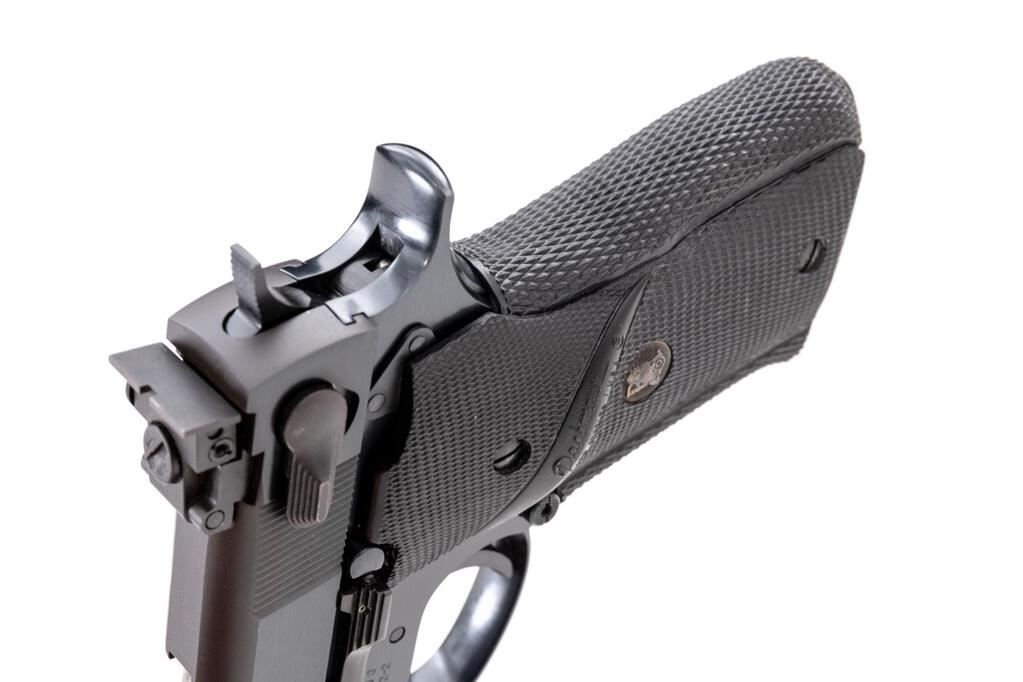 Smith & Wesson Model 52-2 Semi-Automatic Pistol, #TZN6790, single action, .38 Spec. Mid-Range Wadcutter cal., 5" barrel, blue finish, checkered black rubber Pachmayr grips, Patridge front sight, square-notched rear sight is adjustable for windage and elevation, with one blued steel S&W magazine. Includes the original matching numbered box, cleaning accessories, and barrel bushing wrench. Pistol is in excellent overall condition retaining approx. 98%+ factory metal finish, with crisp factory lettering and only a few very minor handling marks. Grips are very good showing moderate handling wear. Action operates smoothly; excellent bore, bright with well-defined rifling. Box shows considerable age and wear. Est.: $900-$1,300. (Modern/PPT)