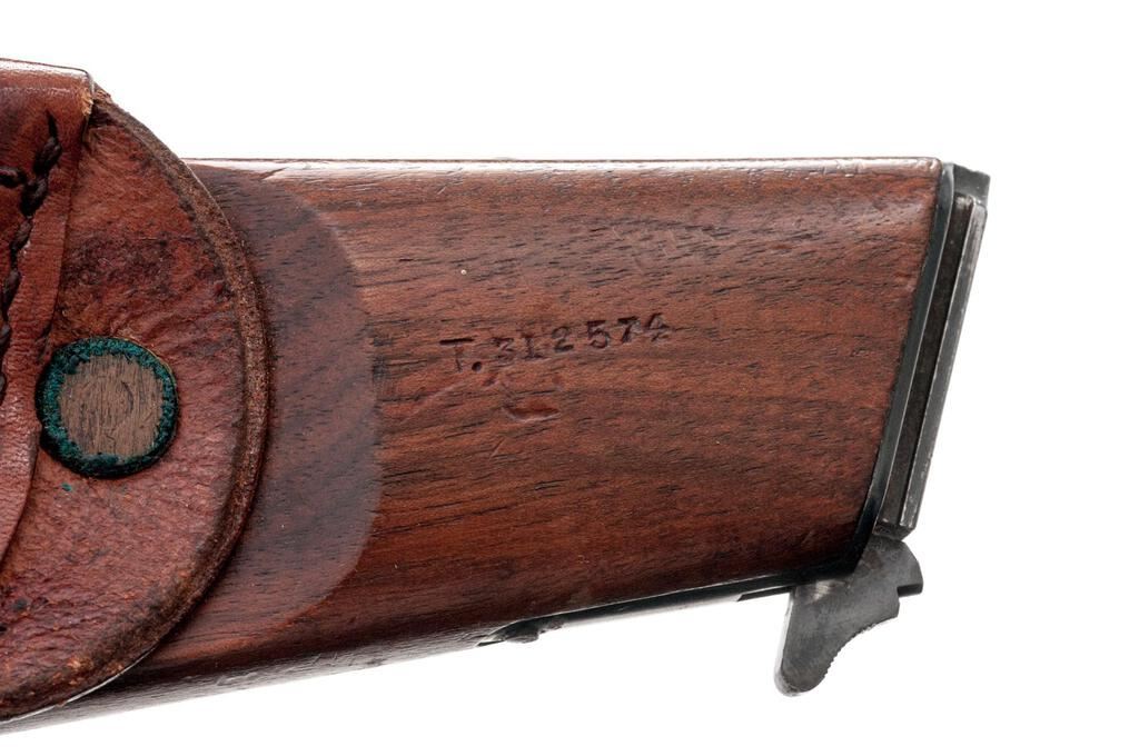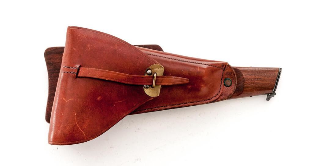 Rare FN High-Power Flat Board Shoulder Stock and Holster, #T312574, hardwood flat board stock with copper rivets retaining leather holster with brass catch. Blued steel attaching lug with spring-loaded catch lever has small proof mark on top that is hard to make out. Blued steel strap plate with round wire loop is attached with four screws to the left side of the stock. Round wire cleaning rod inside holster, fits into a small gray leather pouch. Condition is excellent, the stock having a nice original finish, showing some scratches, minor dings, and light depressions from use. Clear stamped serial number stamped into the wood at the front right side. Blued metal parts show light wear and scratches from use. There is one tiny rust freckle on the lower edge of the front lug, near the retaining screw. Leather holster shows light scuffs, minor scratches and wear marks where the muzzle of the pistol fits. Brass catch and loop on the holster has some green verdigris where it touches the leather parts, and a slight crease on one side of the brass fitting. Copper rivets show some verdigris around the edges. Cleaning rod shows little to no use. Inside of top flap shows some scratches from the pistol going in and out of the holster. Est.: $1,000-$1,500.
