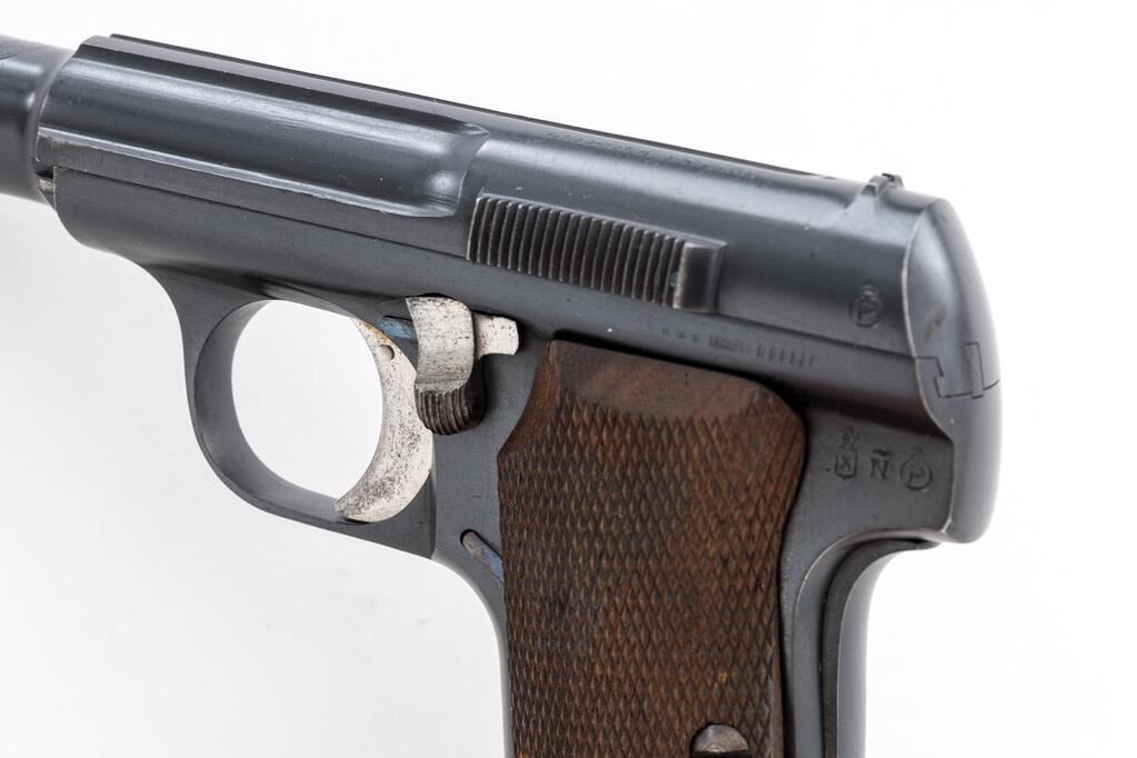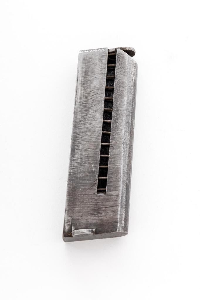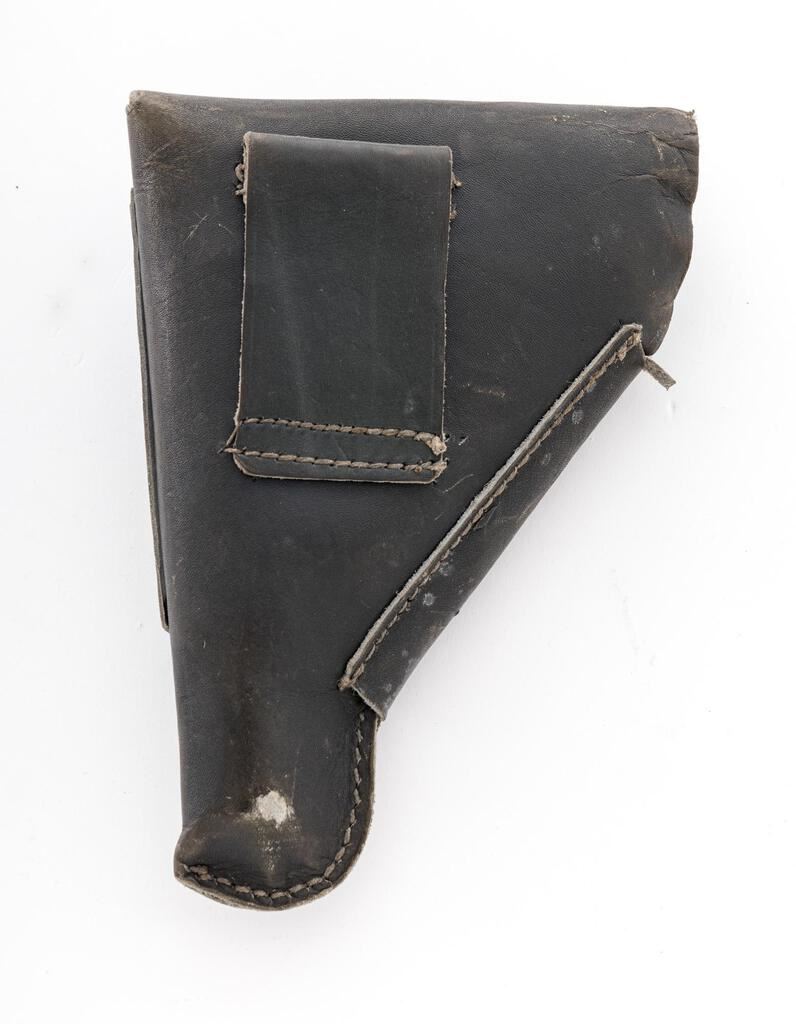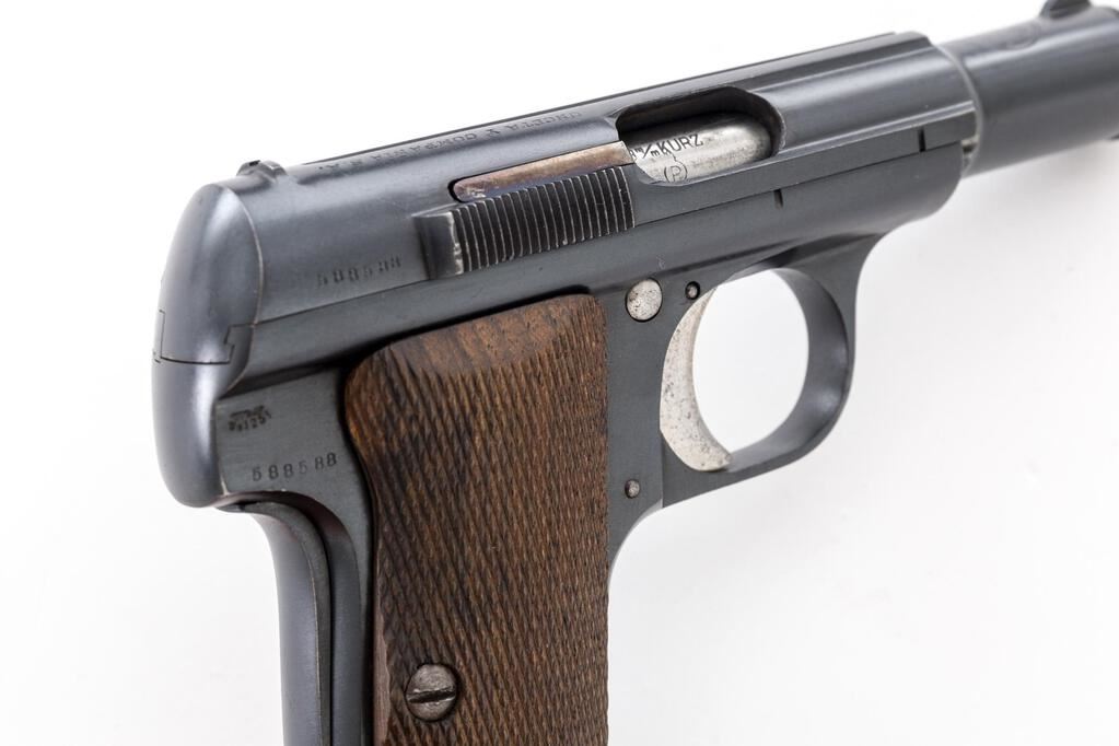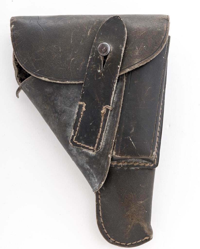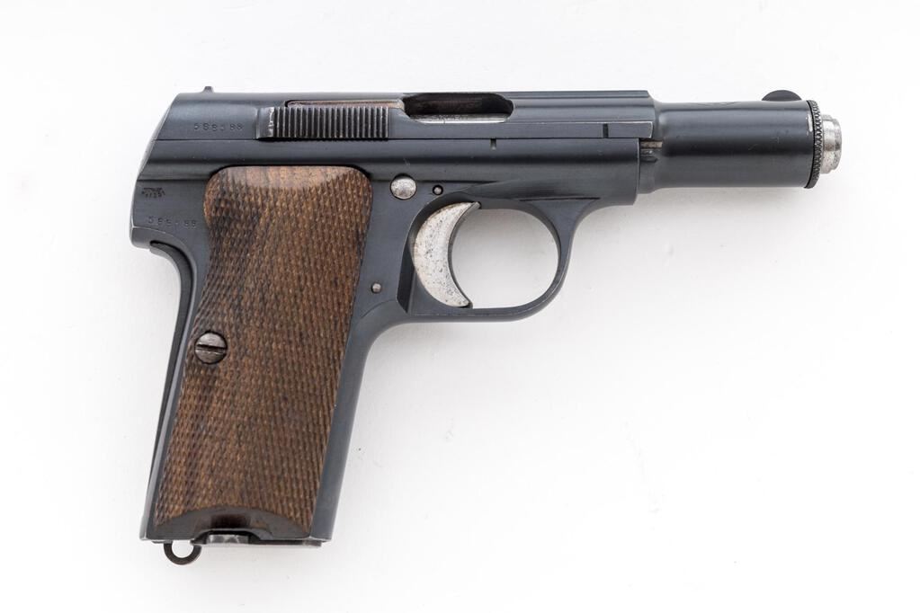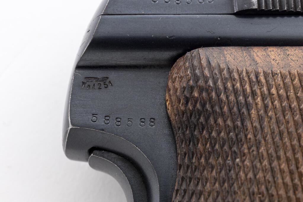 German Marked Astra Model 300 Semi-Automatic Pistol, with Holster, #588588, .380 (9mm Kurz) cal., 4" barrel, blued finish, with fire blue and in the white small parts; Spanish proof marks on frame and slide, Nazi "(eagle)WaA251" waffenampt on frame, barrel marked 9m/m Kurz with Spanish proof mark, Astra logo and address on top of slide; fixed blade front sight, integral fixed rear sight with small "u" slot, grip safety, lanyard loop, checkered wood grips, two blued steel magazines with Astra logo on toe, and dark green Italian type leather holster. Condition is good retaining approx. 97%-98% original finish, with a small scratch on the slide near the knurled muzzle ring, a couple of very light marks on the knurled ring, slight high edgewear to the front of the slide and slide serrations, age graying and light freckling to the trigger and safety lever, age graying and light wear marks on the barrel, and light wear to the visible fire blued spring parts. Barrel appears to have a bulge ring an inch or so in front of the chamber; the bore is mostly bright with light frosting. Action and safeties function properly. Grips show only light wear and a few flattened diamonds, with a small ding on the lower edge of the left grip. Grip screws have light turning marks. Magazine in the gun shows some wear and lines from use; magazine in the holster shows heavy wear to the finish, lines and scratches from use, and freckling to the base plate. Holster shows age, soiling, scuffs, scratches, and light use, with some whitish residue. Leather body is sound, and there are no visible markings; it looks Italian but it is made in the German style. Mag pouch is a bit long for the Astra magazine, but the gun fits ok in the holster. Est.: $900-$1,200. (C&R/PPT)