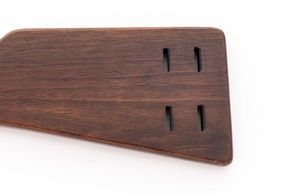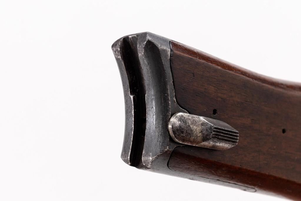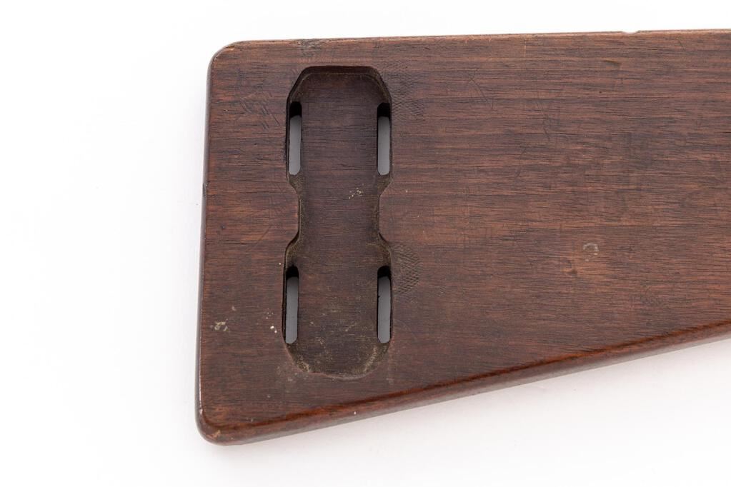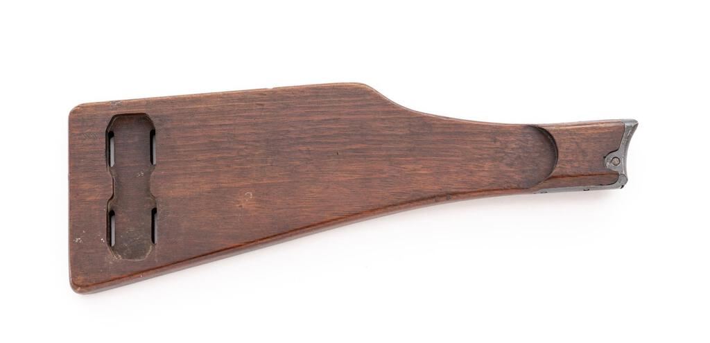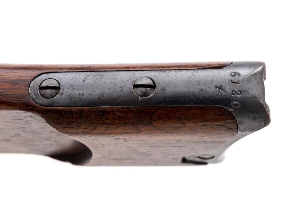 Rare Commercial Navy Luger Flat Board Shoulder Stock, #6120f on metal attachment fitting, no metal disc (as is correct for this type), measures approx. 12-5/8" long (center), has four slots and grooves in rear for mounting to a leather holster, with three small holes on left side wrist area. No other visible markings. Condition is very good showing numerous small scratches, depressions, dings, marks from use, and the mounting of a holster at one time. Wood has a nice dark original patina with no signs of refinishing. Metal fitting shows minor age and wear to the original bluing with light freckling. Straw finish on the locking knob is fading somewhat with light freckling and minor pitting. A rare accessory for a Naval Luger. Est.: $1,800-$2,400. (Non-gun)