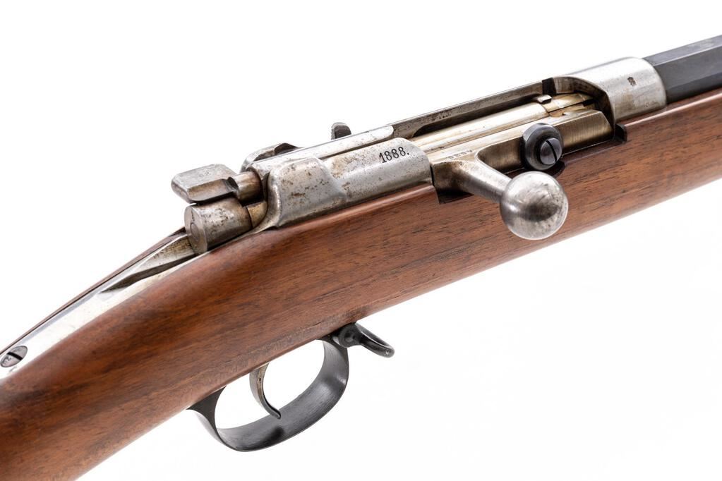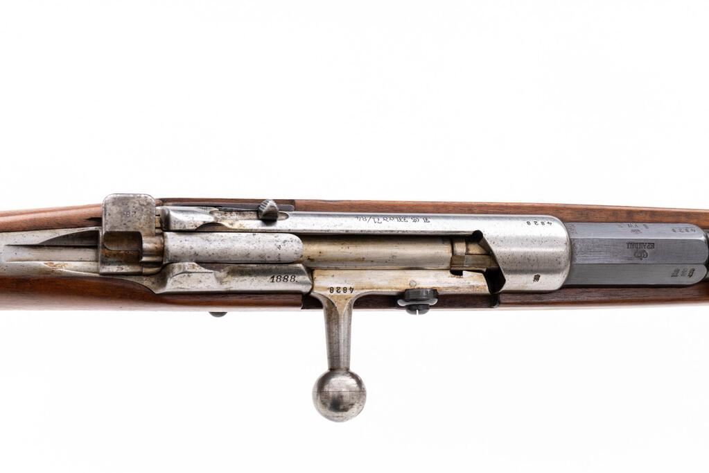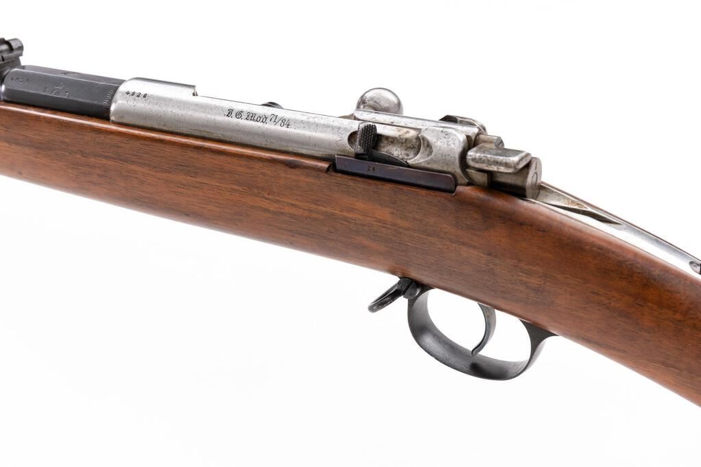 German Model 71/84 Spandau Mauser Bolt Action Rifle, #4828, 11mm x 60mm Mauser cal., 31.56" barrel, blued and in-the-white finish, drift adjustable inverted "V" fixed front sight and tangent rear sight adjustable to 1600 yards, Imperial German proof marks, with 8-rd. tubular magazine. Dated 1888, made at the Spandau Arsenal, selector for single shot or magazine feed, all visible numbers matching, straight grip walnut stock with three barrel bands, front band with side bayonet lug, stacking rod, and steel buttplate. Condition is excellent retaining most all of its original blued finish on the barrel, with some dried grease residue, scratches on the upper two barrel bands, freckling on the trigger guard strap, and light scratches and dings on the trigger guard bottom and sides. Receiver and bolt are in the white and show dried grease residue, light freckling, and minor age graying. Action and safety function properly, but a bit sticky due to the dried grease; bore is bright, with light soiling that should clean to very good. Stock shows minor dings, scratches, scuffs, and clear stamped proofs and markings. Buttplate shows light rust spots and dried grease residue. Most of these 71/84 Mausers did not see much action, and this example is in mostly unissued condition after 130 years. Est.: $1,000-$1,500. (Antique)