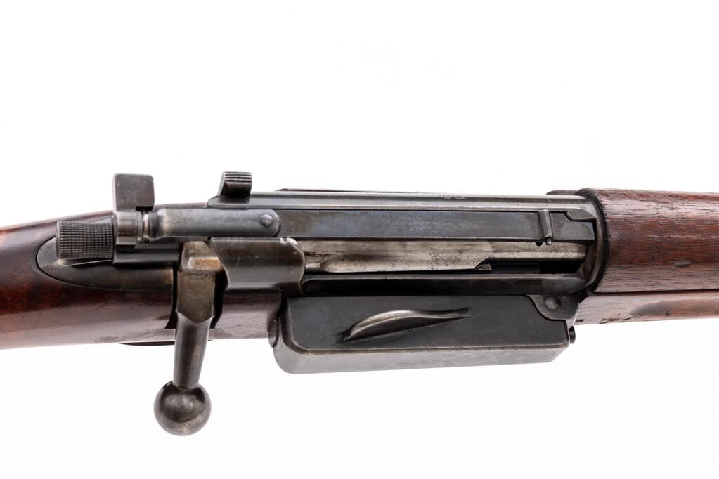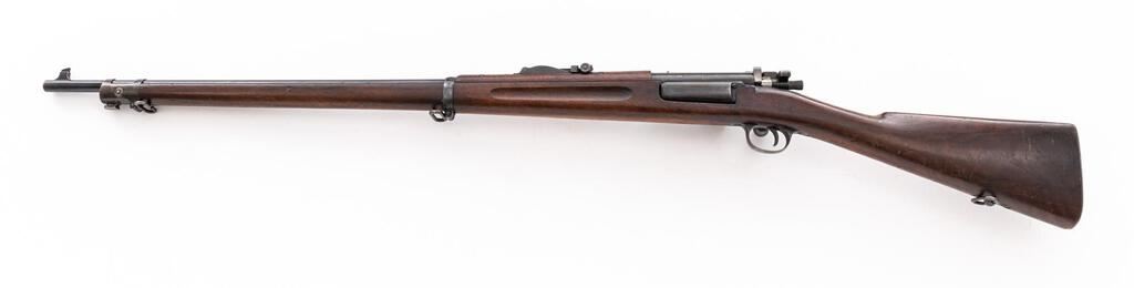 U.S. Springfield Armory Model 1898 (Krag) Bolt Action Rifle, #289995, .30/40 Krag cal. 30" barrel. Bolt and magazine both work very well but the bolt has a carbine headless cocking piece. Rear sight is a Model 1898 that was arsenal modified by re-shaping the sighting area and adding a peep. Receiver and barrel have a considerable amount of arsenal blue with light wear in some places. Trigger guard has lost finish on the bottom and the buttplate is mostly brown. Stock and hand guard are very good with light dents and scratches throughout due to military use. Stock has a build-up of linseed oil or varnish, a very good JSA/1900 cartouche on the left side, and "(circle)P" behind the trigger guard. There is a rack number 872 stamped into the right side of the stock near the buttplate. Bore shows good rifling with light erosion throughout. No cleaning rods or oiler are present. Est.: $800-$1,200. (C&R)