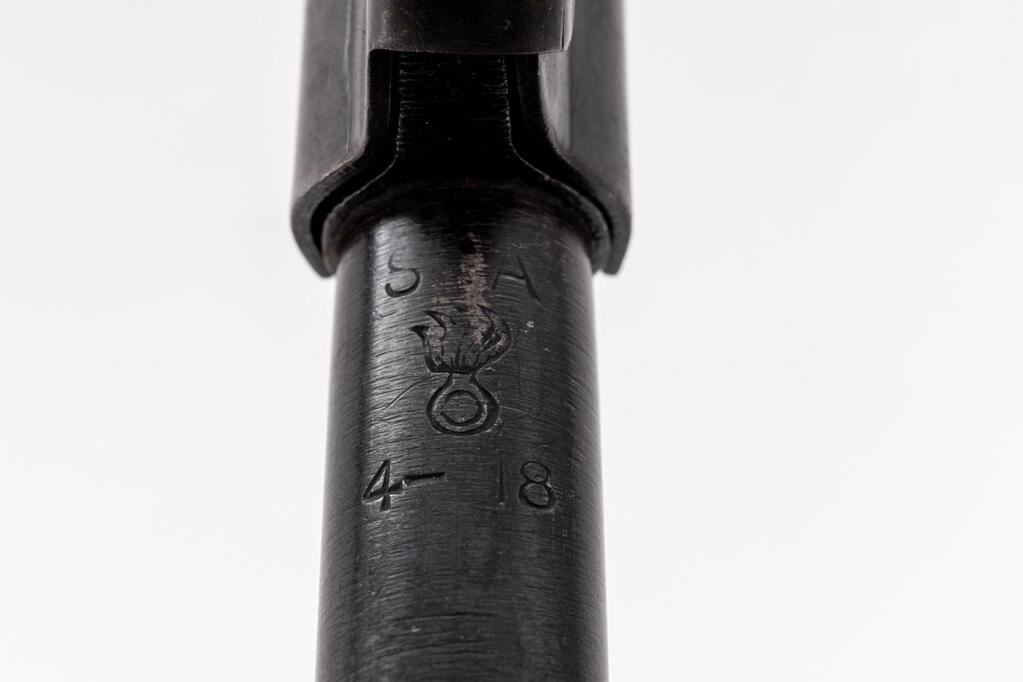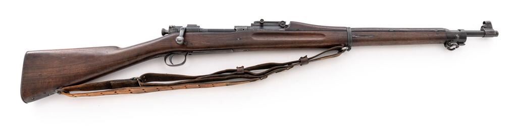Springfield Model 1903 Bolt Action Rifle, #662193, .30-06 cal., 24" barrel, blued finish, walnut stock set, blade front sight with attached hood and adjustable folding leaf rear sight. A fair condition U.S.G.I. Model 1907 leather sling is attached to the swivels. Marked on top of receiver ring "U.S. SPRINGFIELD ARMORY MODEL 1903". Barrel behind front sight is marked "SA(Flaming Bomb)4-18". There is a boxed "J.E.C." cartouche on the left-side forward of the wrist and a faint "(circle)P" firing proof on the underside of the wrist. Condition overall is very good with the metal retaining approx. 80% finish, with the receiver now toned to a silvery color. There is a crack to the left-side forend below the rear sight, otherwise the wood is good, showing handling marks and scratches to the darkened finish. Action operates smoothly, bright bore is good with good rifling. Est.: $1,000-$1,200. (C&R)