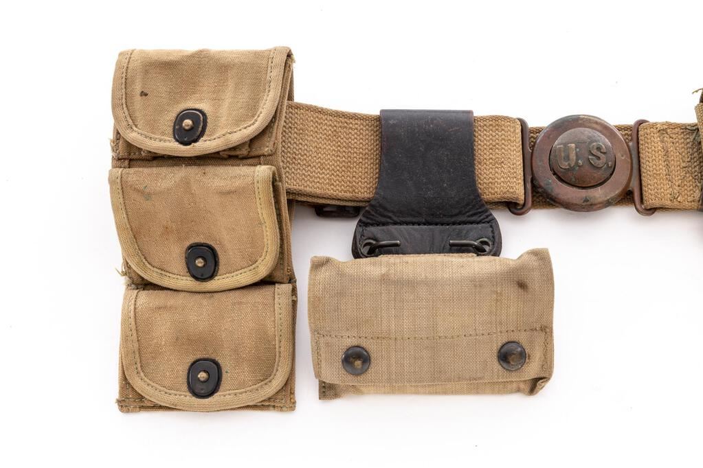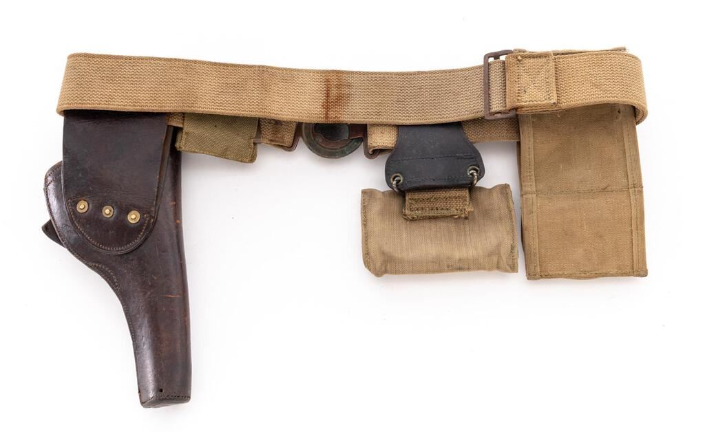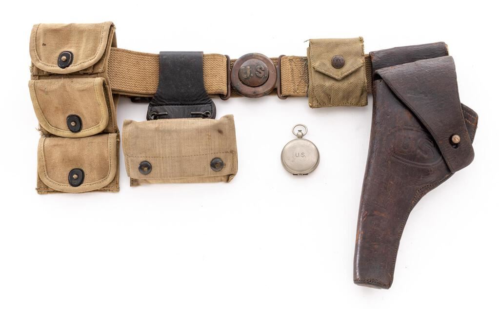 M1910 Garrison Belt Set: (1) An unusual M1910 garrison belt with interlocking U.S. buckle. In good condition with wear and staining. Buckle and belt slides have an even patina but no original finish. (2) Mills unmarked rimless eagle garrison pouch with a U.S. compass. Pouch is in fair condition; U.S. marked compass made by Wittnauer is excellent. (3) Model 1917 pouch for half-moon clips, unmarked, showing use and some staining. (4) First aid pouch L.C.C. & CO. 1918, attached with a leather slide. Good condition with use and some staining. (5) Model 1909 Rock Island Arsenal holster in fair condition. Leather is weak, especially at the flap, which was repaired using a piece of leather glued to the underside and the plug was replaced. RIA holsters were made from 1909 to 1911. Est.: $400-$600/Set.
