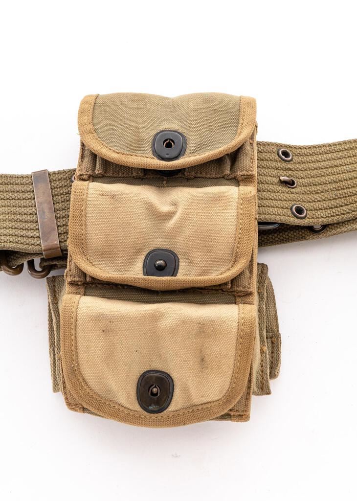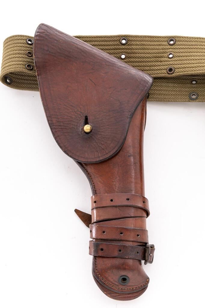Officer's Private Purchase Holster Set: (1) M1910 green pistol belt, made without the snap, marked Mills on the metal end, in very good condition with light wear from use. (2) M1917 pouch for half-moon clips, marked Gregory & Reid 10-18, in good condition. The two bottom flaps are lighter. (3) First aid pouch, marked L.C.C. & CO. 1918, pale green/tan. Pouch shows use and belt hook has been replaced. Bauer & Black US ARMY MAY 1918 bandage tin has the pull ring, with dents and areas of missing finish. (4) Abercombe & Finch holster is for a 1917 revolver and has the leg strap. The private purchase holster and leg strap are in very good condition with some wear and scuffs. Est.: $600-$800/Set.