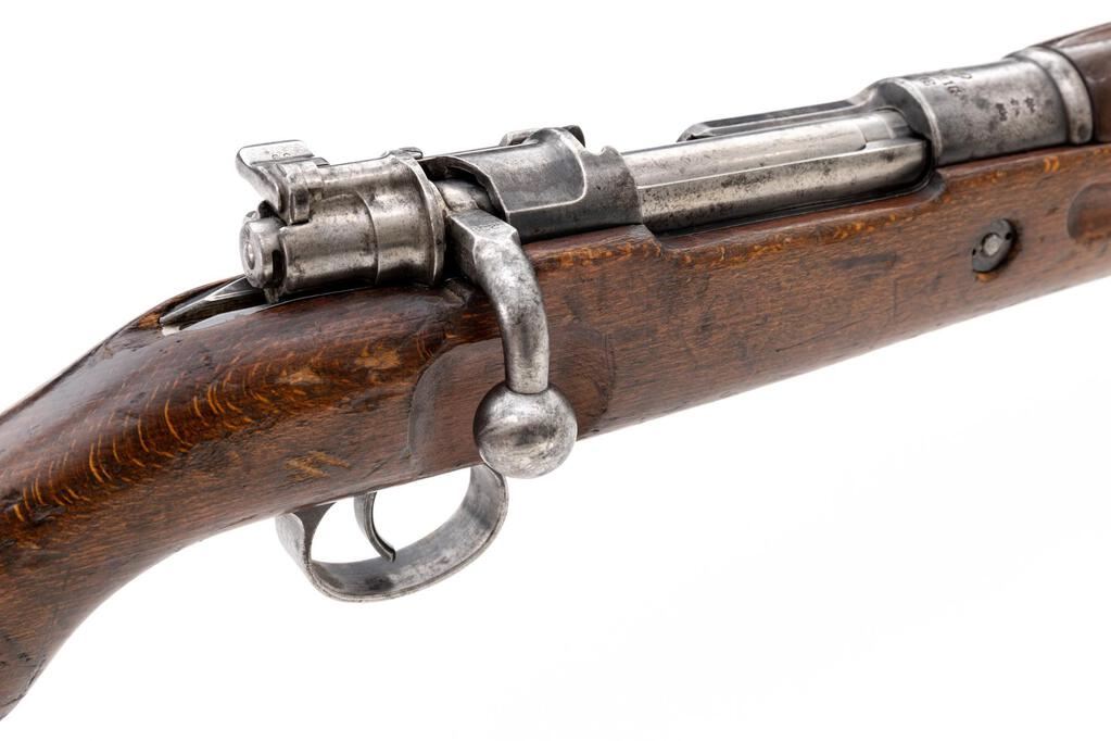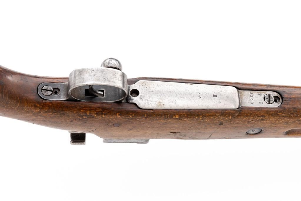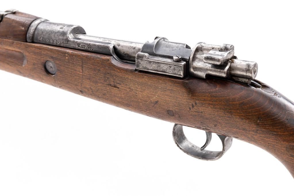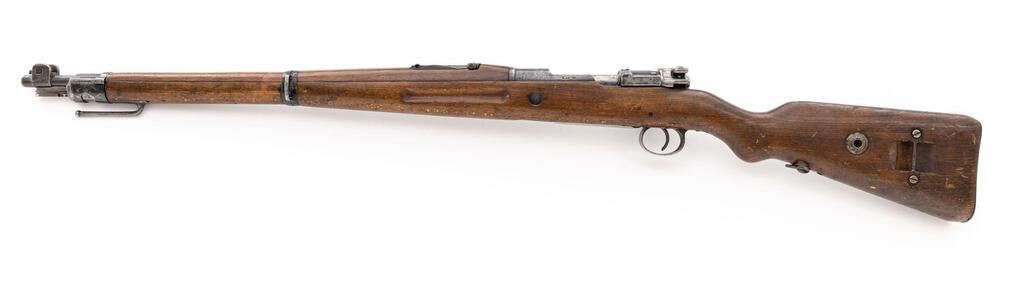German Kar98a Mauser Bolt Action Rifle, #5239, 8x57mm, 23.62" barrel, blued finish, hardwood stock set, inverted "V" front sight and adjustable tangent rear sight. Marked on top of receiver ring "(crown)/DANZIG/1912". Left-side receiver rail marked with Imperial Eagle and "Kar.98." in Gothic script. Matching numbers on bolt assembly and trigger guard/magazine. Mismatched numbers on underside of buttstock and on barrel bands. Inside of bolt handle is flat with checkering. There is a transverse wood dowel repair to the stock forward of the wrist, and the trigger guard locking screws are missing. Condition overall is good with the metal retaining about 40% finish showing patina to the buttplate. Wood is good with overall bruises, scuffs, and scratches to the finish. Action operates smoothly, bright bore is very good with very good rifling. No visible import marks. Est.: $1,000-$1,400. (C&R)