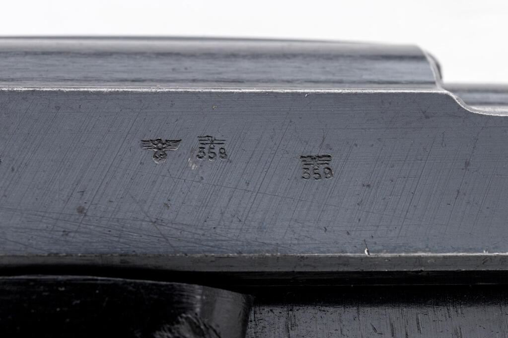 WWII German P-38 ac-43 Semi-Automatic Pistol, with Holster, #1956m, 9mm, 5" barrel, blued finish, double action, Nazi eagle firing proof on slide, "(eagle)359" waffenampts on frame and slide, hammer drop safety, drift adjustable replacement blade front sight and fixed rear sight with small "u" slot, all visible numbers matching, lanyard loop, bottom mag release, black plastic grooved grips, two (2) blued steel magazines marked "P.38v", with small "(eagle)359" proof on rear spine. In black hard shell P-38 holster. Condition is good retaining approx. 80% original blued finish, with wear to the bluing on the barrel muzzle and sides, light wear spots on top of barrel at chamber area, sides and top of the slide, front of the frame and trigger guard. Front grip strap is thinning to gray with light freckling; rear frame lug is thinning to gray, wear to the tops of the sights, and tips of the safety and hold open levers. Rear frame lug, lanyard loop, mag release lever, and bottom of the magazine show heavy rust pitting that has been cleaned. Magazine in the gun has the pitted bottom plate, wear and mottling to the finish, and lines from use. Magazine in the holster is very nice, showing just the slightest use and minor wear marks. Action, hold open, and hammer drop safety all function properly; bore is bright and shiny. Grips show light wear, some scuffs, and scratches. Holster is marked on the back "P-38", "eue43", and "(eagle)WaA300". Holster shows wear, scuffs, scratches, and minor cracking and crazing to the leather; the internal pull strap is in good shape. Est.: $1,000-$1,500. (C&R/PPT)