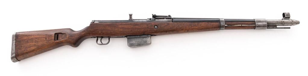 WWII German G-41 duv43 Semi-Automatic Rifle, #7531a, 7.92mm x 57mm, 21.5" barrel, blued finish, gas-operated semi-automatic action, receiver marked "duv43" for Berliner-Luebecker Maschinenfabrik 1943, all visible numbers matching, "(eagle)214" waffenampts, Nazi eagle firing proof, 10-rd. non-detachable magazine, stamped steel trigger guard, bayonet lug, cleaning rod, drift adjustable blade front sight with sight hood and tangent rear sight adjustable from 1 to 12. Laminated wood stock with large eagle waffenampt stamped markings, cupped buttplate, stamped barrel bands, black-painted wood upper hand guard, side sling slot in butt. Has provision for mounting a zf-40 scope on top of receiver, as most do. Condition is good retaining approx. 40%-50% original war-time blued finish, with wear and cleaning to the front of the barrel, barrel shroud, front sight and hood, wear to the barrel bands, top of the bolt carrier and receiver, scratches, wear, and one ding to the magazine body, and wear to the trigger guard and edges. Action and safety function properly, bore is lightly frosted overall with strong lands and grooves. Stock shows numerous scratches, dings, small gouges, and soiling. Upper hand guard is wood with a black-painted finish showing scratches and dings. Buttplate has rust freckling and age graying. Stock is numbered to the action. Rare to find a G41 with matching numbers. Est.: $5,000-$7,000. (C&R)