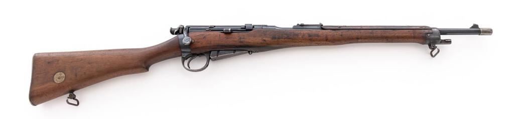 Royal Irish Constabulary Lee-Enfield Bolt Action Carbine, #7543, .303 Brit. cal., 20.75" barrel, blued finish, hardwood stock set, inverted "V" front sight and adjustable folding leaf rear sight. Marked on left-side action body with original carbine markings "(Crown)/V.R/ENFIELD//1898/L.E.C/I". Right-side buttstock with over-stamped roundel dated "1901". Brass buttstock disc contains conversion markings "6'/04/R.I.C/4322". Mismatched number on rear of bolt handle. Carbine is fitted with bolt dustcover, early cocking piece, and 6-rd. magazine. Converted from standard carbine by strengthening forend and attaching bayonet mounting bar. Condition overall is very good with the metal retaining over 80% finish, showing patina to left side barrel shank and toning to front band. There are two cracks and an arsenal repair to the tip of the forend with the wood lightly sanded, now good, showing mostly old handling marks to the finish. Action operates smoothly, bright bore is excellent with sharp well-defined rifling. Old Birmingham export proof marks on left side of barrel shank. Est.: $1,000-$1,500. (Antique)