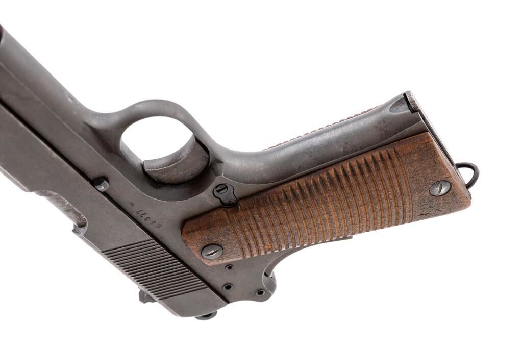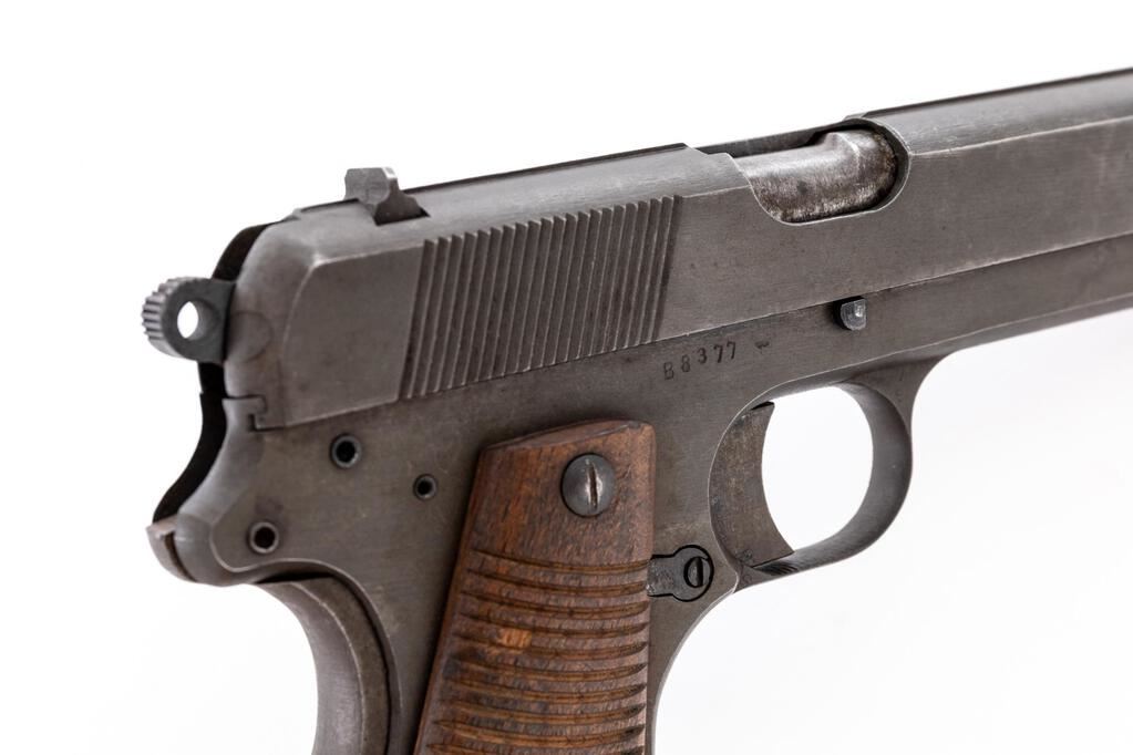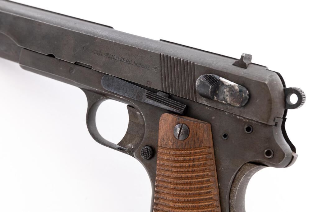 Late WWII German Marked P35 Polish Radom Semi-Automatic Pistol, #B8377, 9mm, 4.7" barrel, phosphate finish with blued small parts, slide marked with FB Radom VIS Mod.35 Pat. Nr.15567, Nazi eagle firing proof, waffenampt "(eagle)/623", "(eagle)77" waffenampt on slide and frame. Fixed thin blade ramped front sight, drift adjustable fixed rear sight with small "v" notch, welded hammer drop safety lever, grip safety, grooved wood grips, lanyard loop at bottom of mainspring housing, and one phosphate steel magazine. Condition is very good retaining approx. 90% original finish, with wear to the front and high edges of the slide, wear line on lower right front of slide, thinning to right side of the slide, dried oil stains on slide and frame, thinning to the finish on the front grip strap, wear on the sides of the trigger, and loss of finish to the welded safety lever. Action, hold open, and safeties all function properly; bore is bright and shiny. Outside of the barrel shows light rust stains and age darkening. Grips show soiling, a few light scratches and roughness, with a couple of small gouges. Grip screws show minor wear with clean slots. Magazine shows wear from use, dried oil stains, and minor rust on the bottom plate. A good Last Ditch example. Est.: $900-$1,200. (C&R/PPT)
